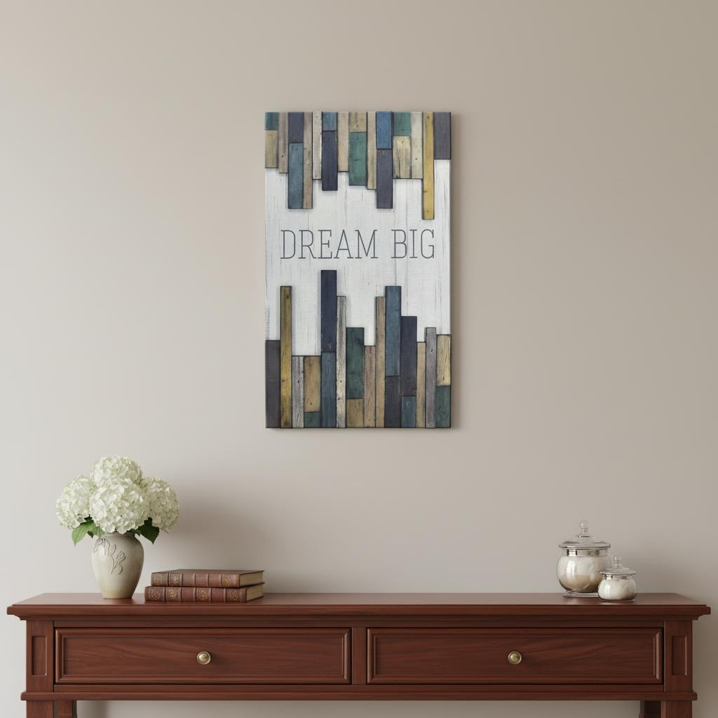 Our words matter, this "dream big" rustic hanging wall decor adds an inspirational and motivational sentiment to your room. Handmade with care, this piece brings some authenticity to your space. Instantly liven up your space with this text decor that brings sentiment, color, and dimension to your walls. Hang on your wall to add some up to date fashion and decoration. Utilize this opportunity to create a focal point in the room with this fabulous wall decor option. 31.50-inch h x 19.00-inch w x 1.00-inch d.