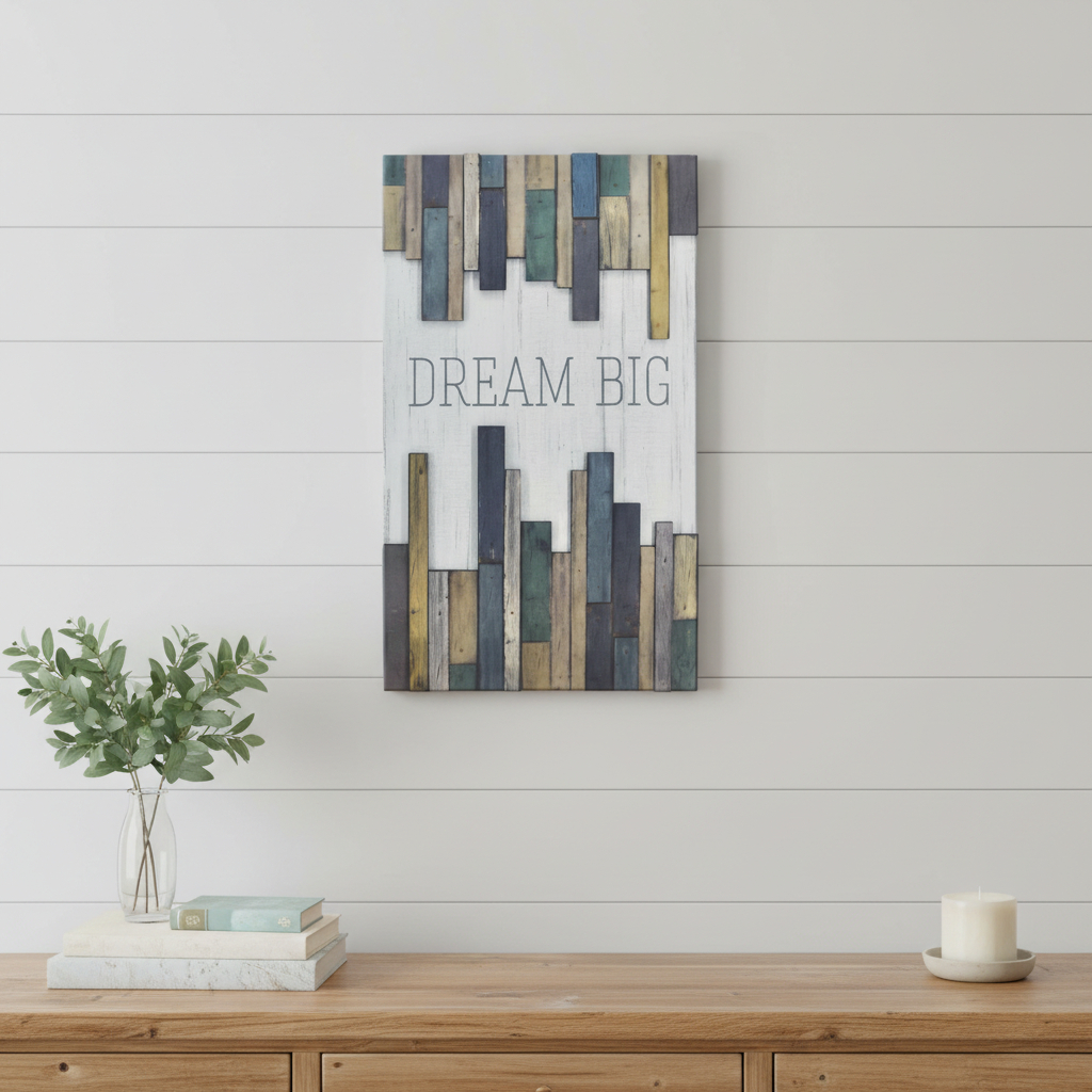 dream big wood wall decor, big wood wall decor, wood wall decor, white dream big wood wall, 32" X 19" blue tan white |