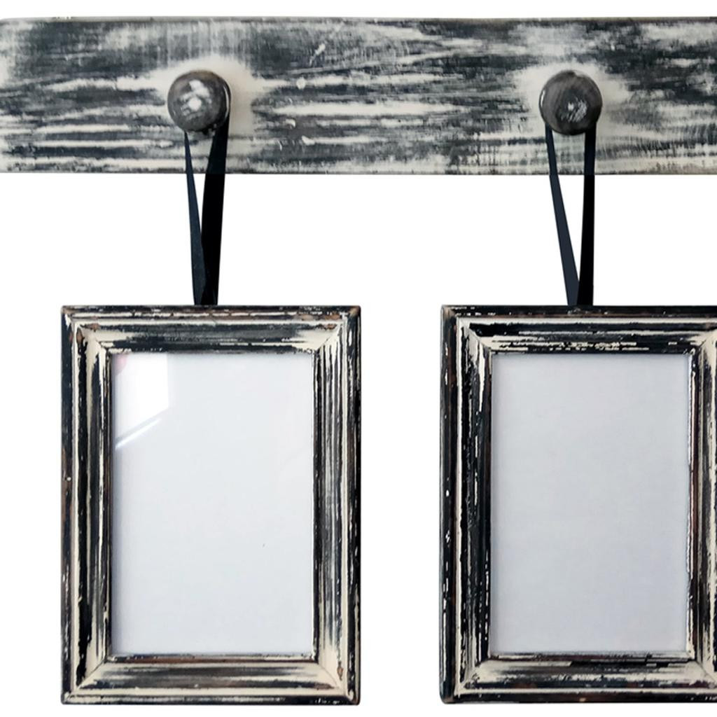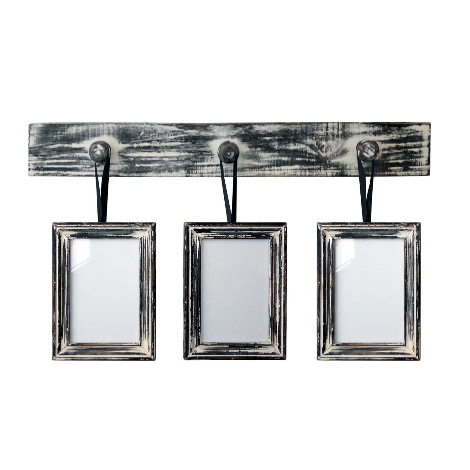 The 4-inch x 6-inch black and white distressed solid wood hanging picture frame is the perfect addition to your home decor. Designed as a gallery wall set, this frame offers a stylish way to showcase your favorite memories. Crafted from solid wood, it boasts a distinctive distressed finish that adds character to any space. This rectangle frame is ideal for horizontal displays, allowing you to highlight your cherished moments beautifully. With mounting hardware included, setting up this piece is effortless and convenient. Perfect for accommodating three pictures, it invites a sense of nostalgia while enhancing your interior design. Elevate your living space with this charming and functional picture frame. 22.00-inch h x 11.00-inch w x 2.00-inch d.
