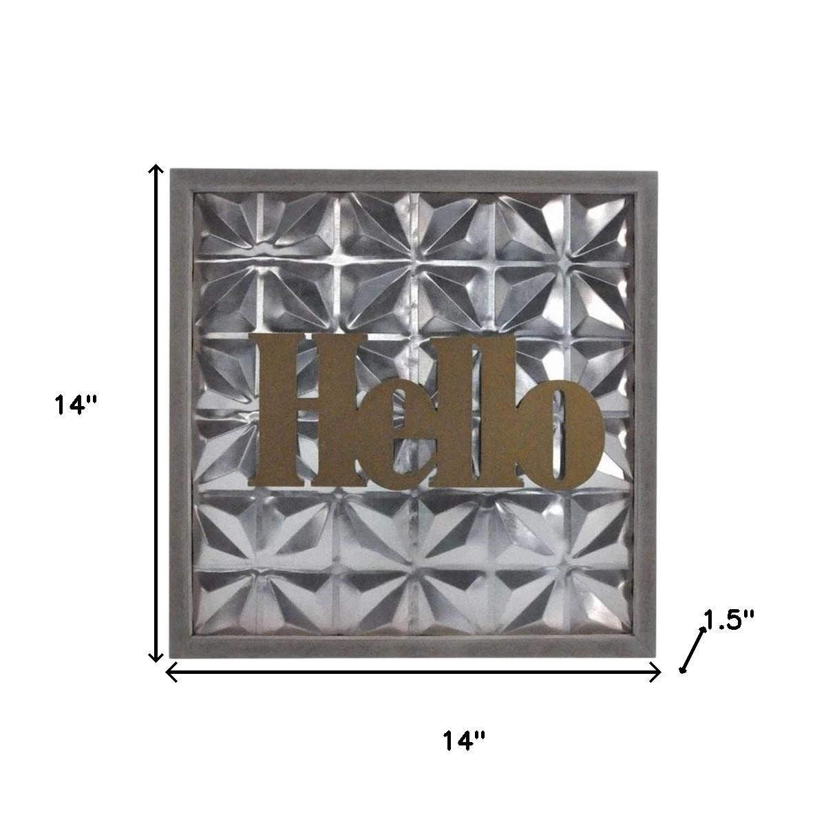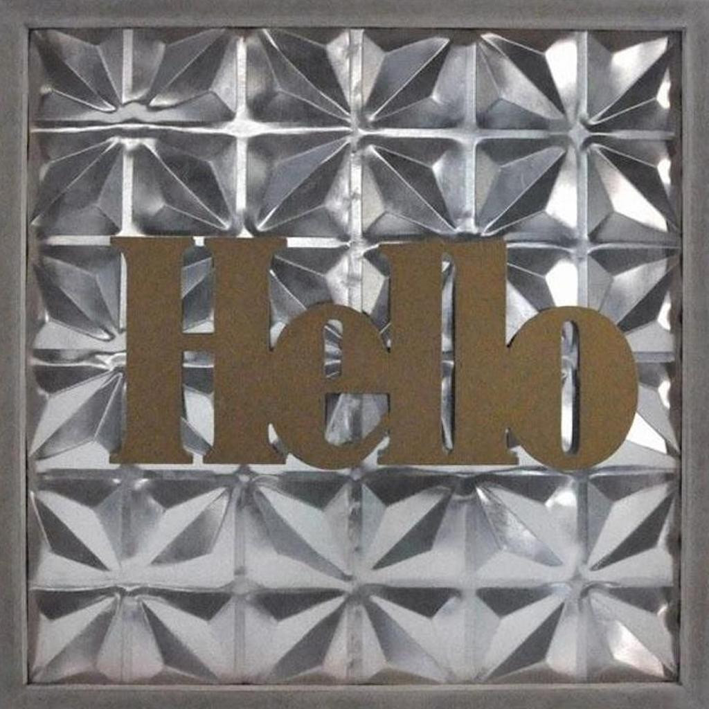 metal wood square wall decor, square wall decor, wood square wall decor, hello metal wood square wall, 14" X 14" antiqued brass gray hello |