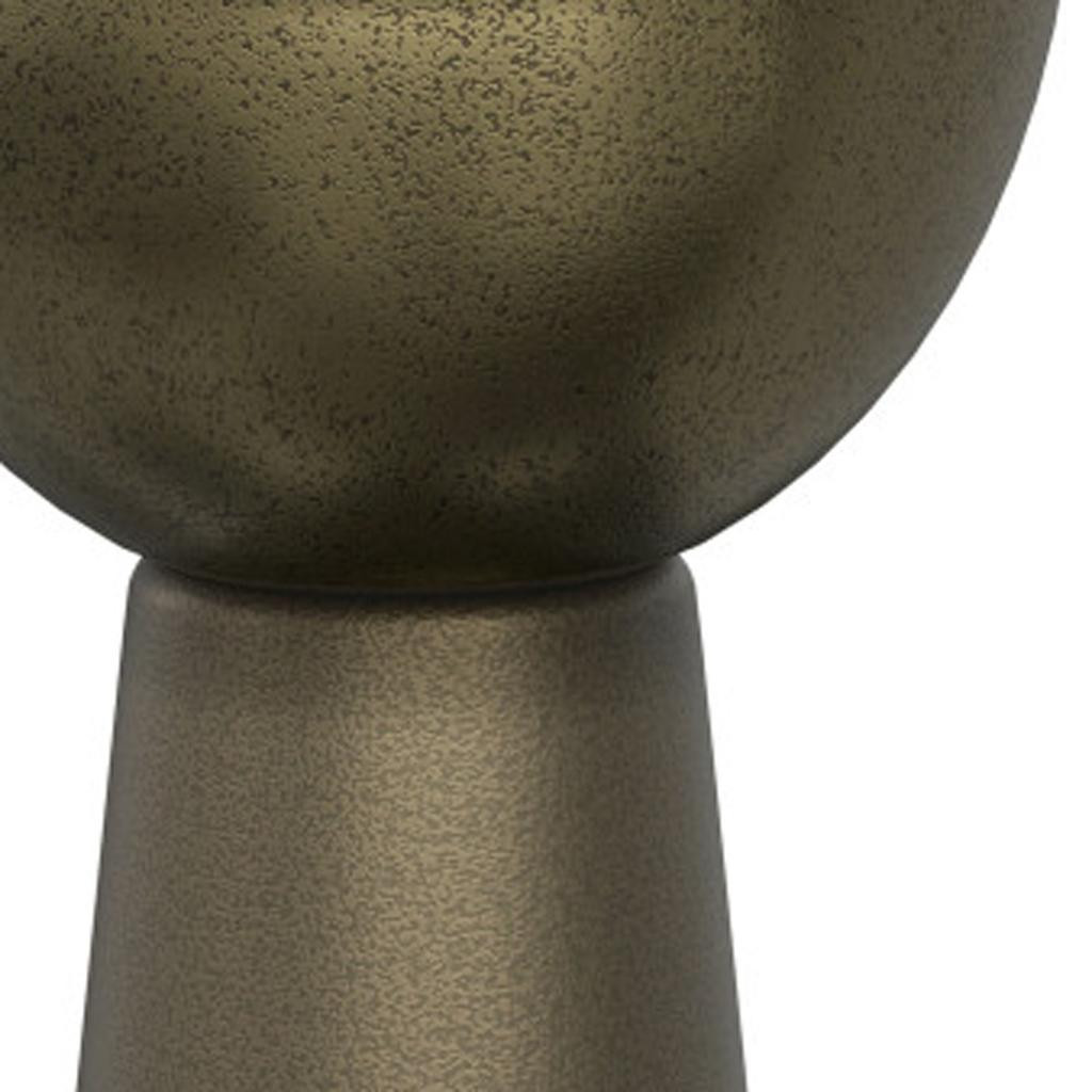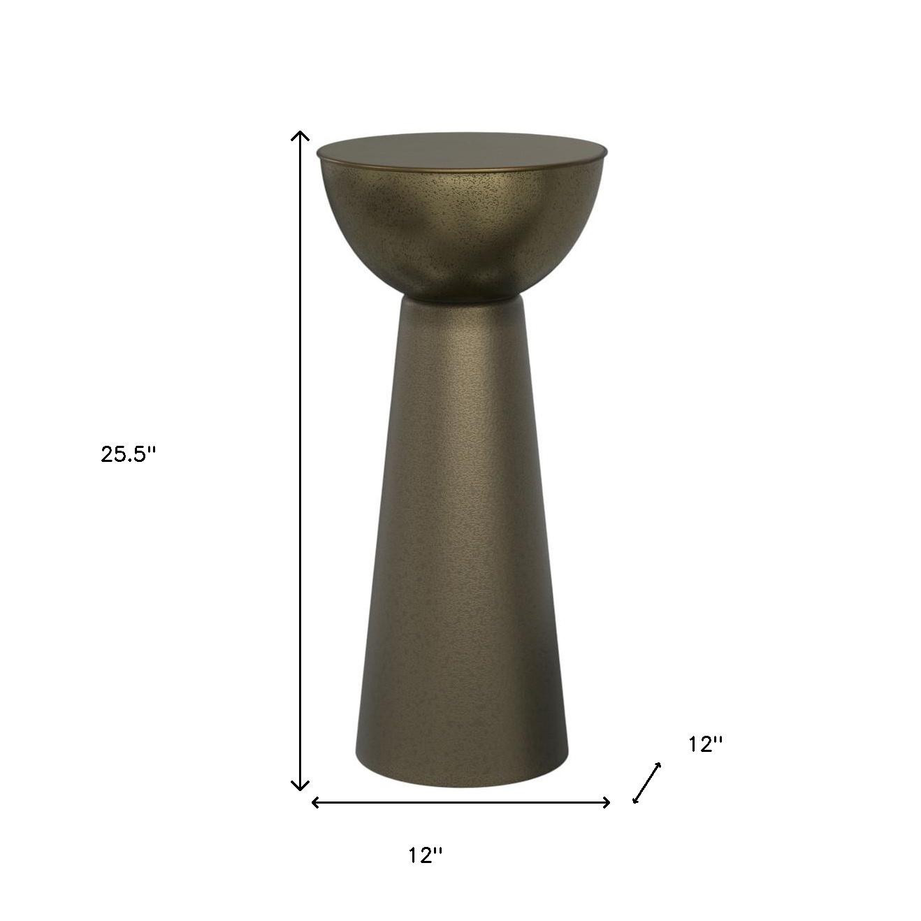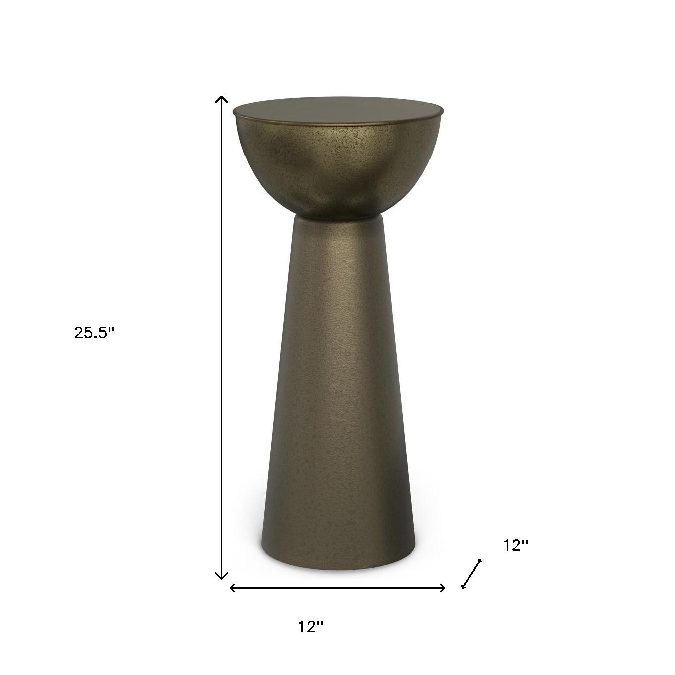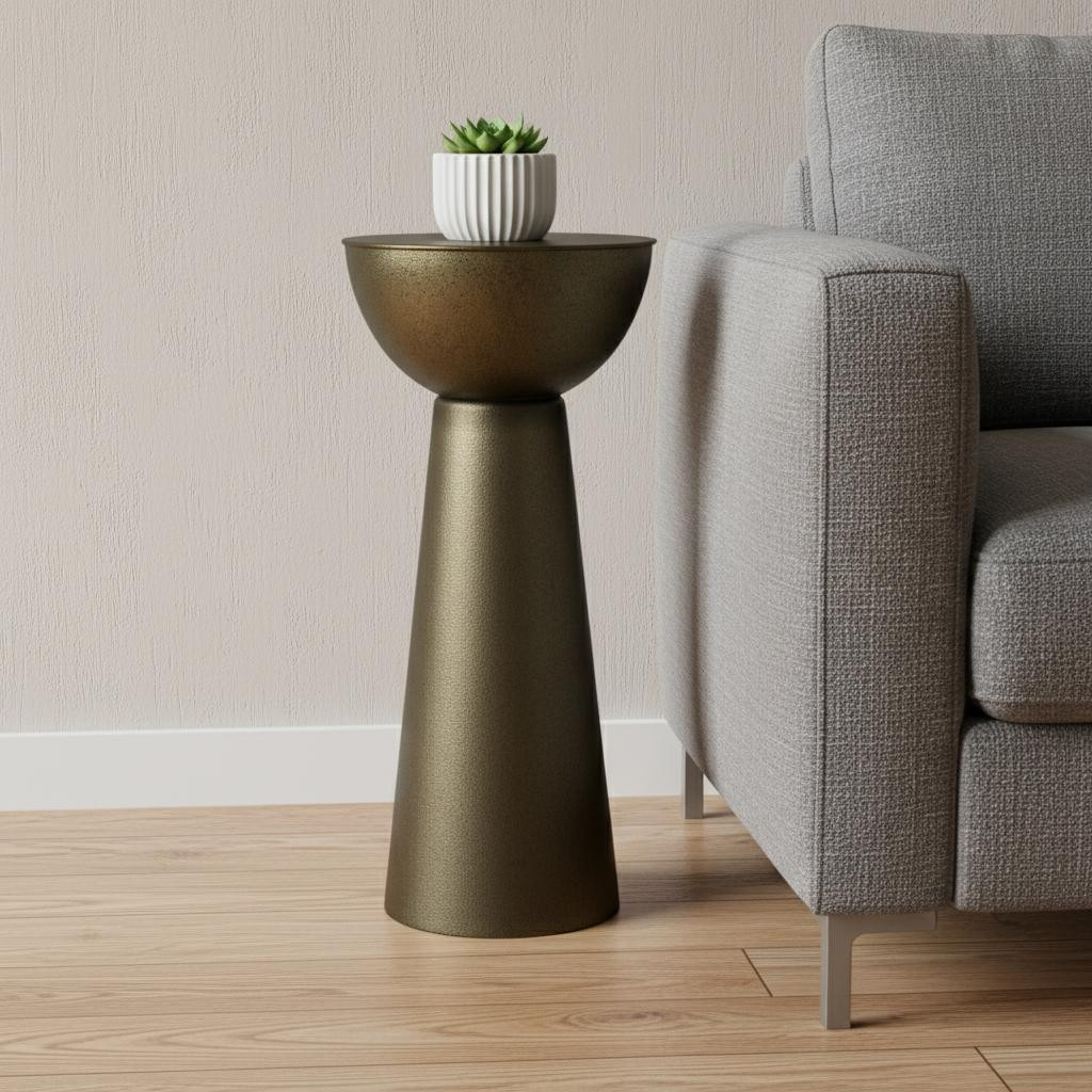 Distinctive in style the 26-inch antiqued gold metal round end table radiates a versatile charm. This table features quality construction from metal and an updated monotone color scheme with antiqued gold as the main color on both the top and the base. An ideal location for placing your snacks and drinks, and a place to keep your lamp, frames, or other accessories. You can match it with other pieces to get the ideal look for your place. 25.50-inch h x 12.00-inch w x 12.00-inch d.