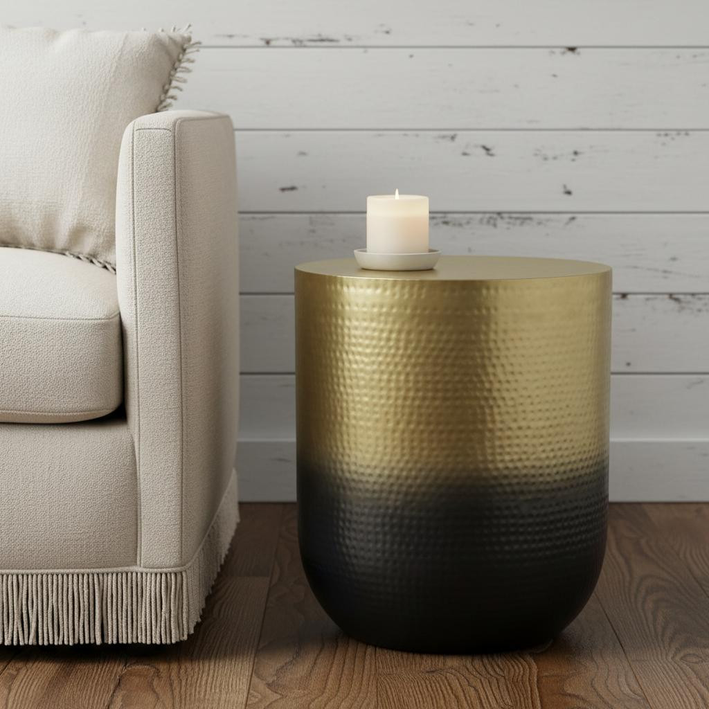 Show off your exquisite taste with this 22-inch gold metal round end table. This table features quality construction from metal and an updated monotone color scheme with gold as the main color on both the top and the base. Side tables are a great way to flank your sofa, use as an accent next to your favorite chair, or can even be used bedside. This versatile table is a great accent for most any room. 22.40-inch h x 18.90-inch w x 18.90-inch d.