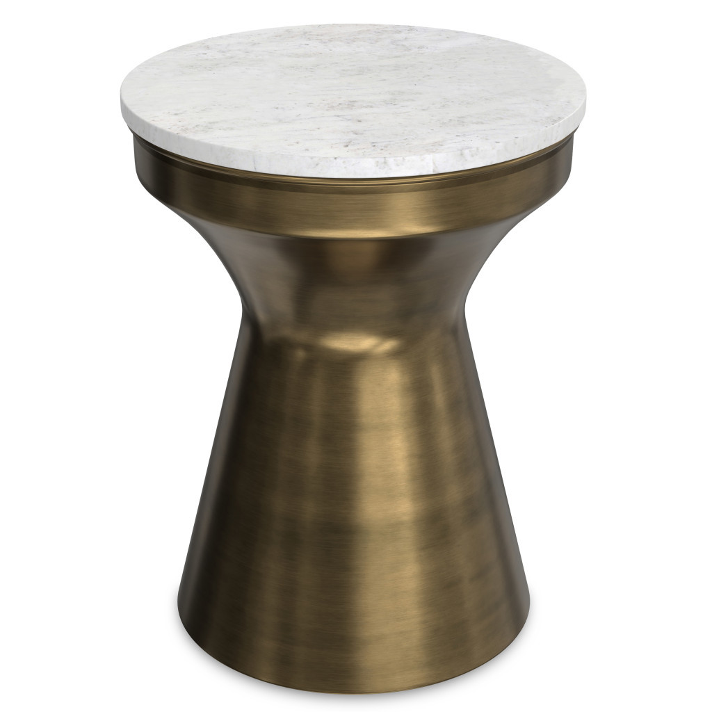 Optimize your space and add some charm to your room with the 18-inch antiqued brass iron round end table. This table features quality construction from iron and an updated monotone color scheme with antiqued brass as the main color on both the top and the base. An ideal location for placing your snacks and drinks, and a place to keep your lamp, frames, or other accessories. This versatile table is a great accent for most any room. 18.00-inch h x 14.00-inch w x 14.00-inch d.