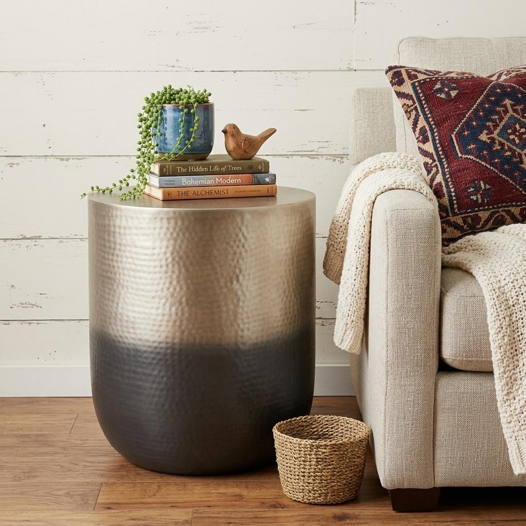 silver metal round end table, metal round end table, 22" silver metal round end, 22" silver metal round, round end table |
