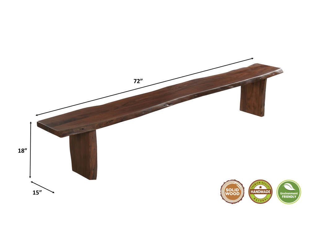 Add a good looking decorative accent to your space that is also practical for seating. This hand-crafted bench is made from high quality solid acacia wood in a brown color throughout the base and top with a live organic style edge and purposefully distressed and rustic finish. Add this bench to your kitchen or dining room for convenient seating at the table. Dining benches are versatile for kitchen or dining room but can also be used in entrance foyer, hallway, living room, bedroom or office. 18-inch h x 72-inch w x 15-inch d.