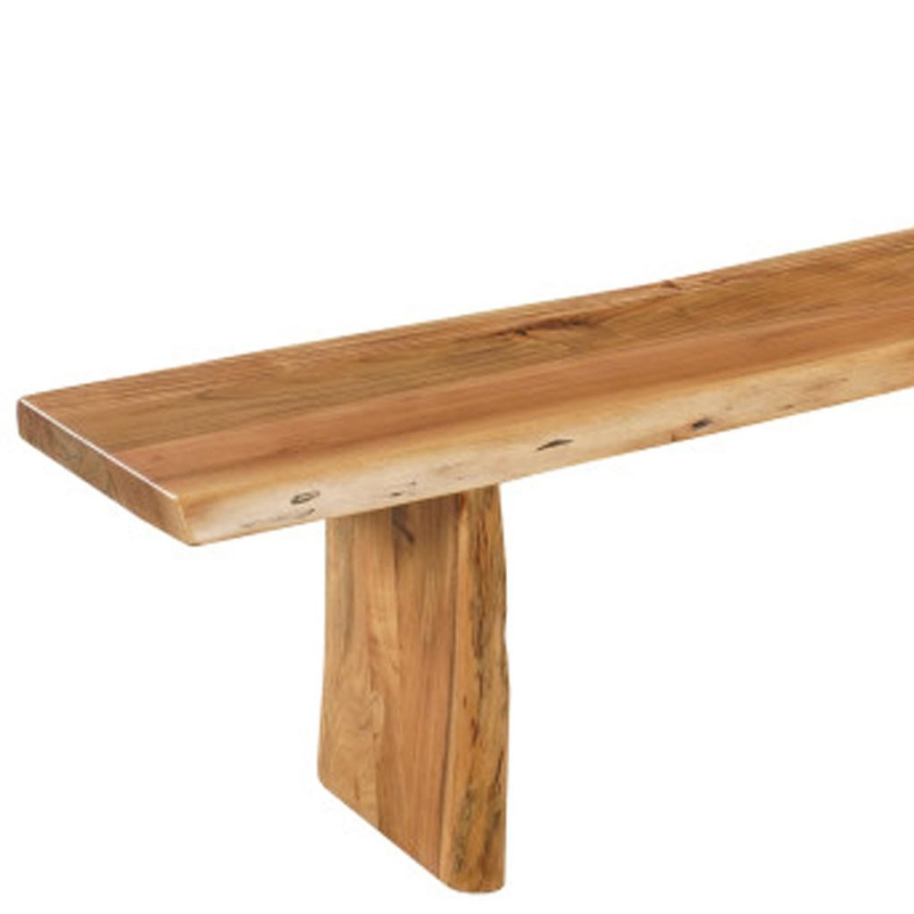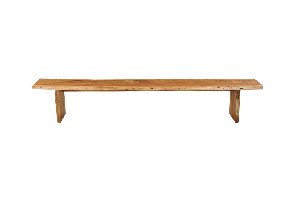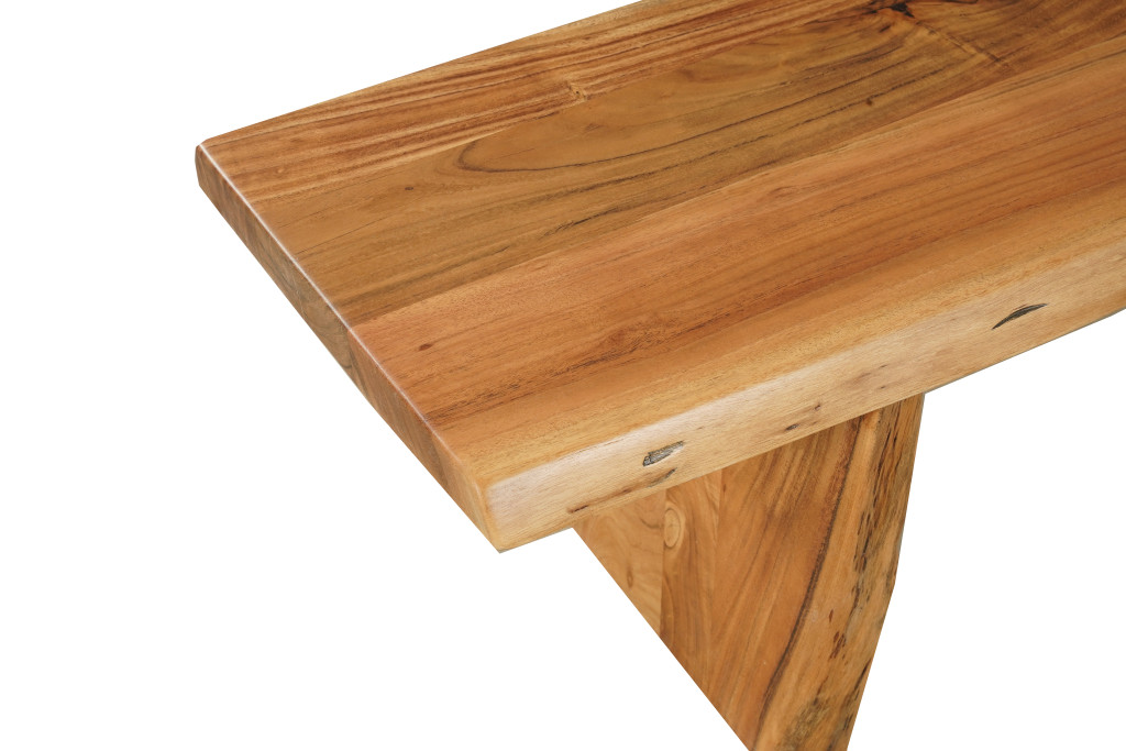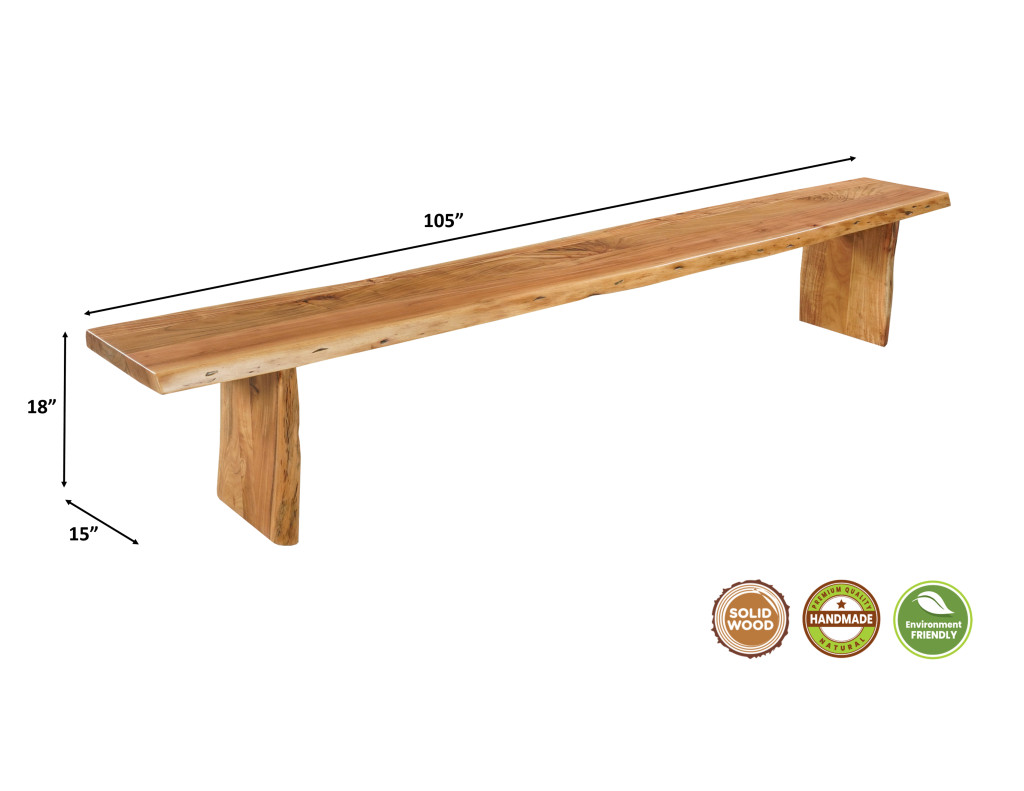 Practicality and fashion mix together with this handy 105-inch natural solid wood live edge dining bench. This hand-crafted bench is made from high quality solid acacia wood in a light natural brown color throughout the base and top with a live organic style edge and purposefully distressed and rustic finish. Add this bench to your kitchen or dining room for convenient seating at the table. Dining benches are versatile for kitchen or dining room but can also be used in entrance foyer, hallway, living room, bedroom or office. 18.00-inch h x 105.00-inch w x 15.00-inch d.