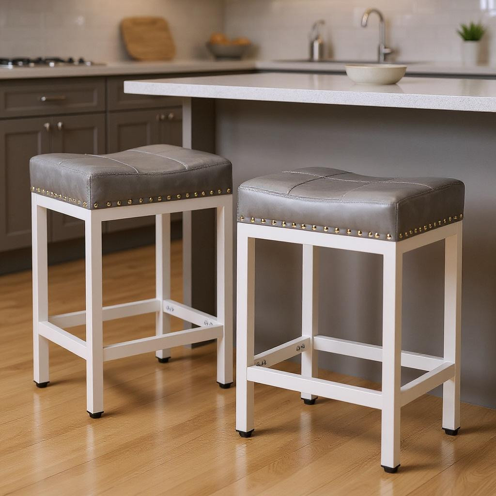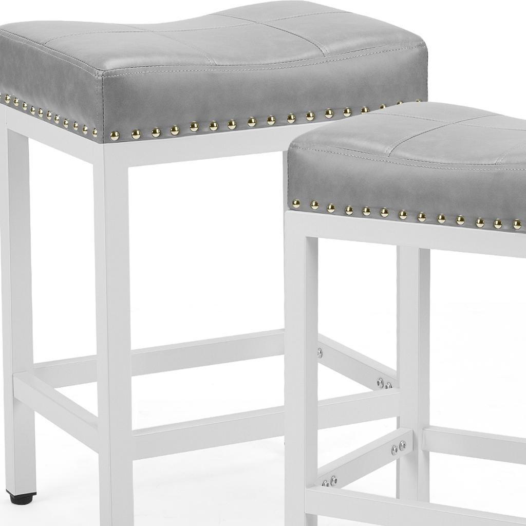 Comfort and design come together nicely in this set of two 22-inch gray and white faux leather and steel backless bar stools. The white coloration of the high quality steel base marries nicely with the gray faux leather seat and is accented by stylish nail head trim detailing. The backless and armless design mixes with a slightly scooped rectangular saddle shaped seat to make this chair both comfortable and fashionable. 21.60-inch h x 17.50-inch w x 17.90-inch d.