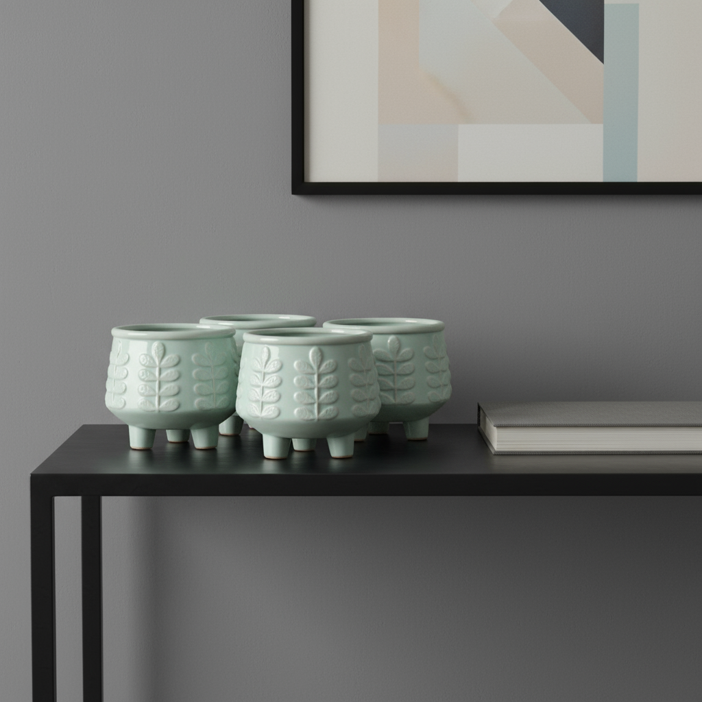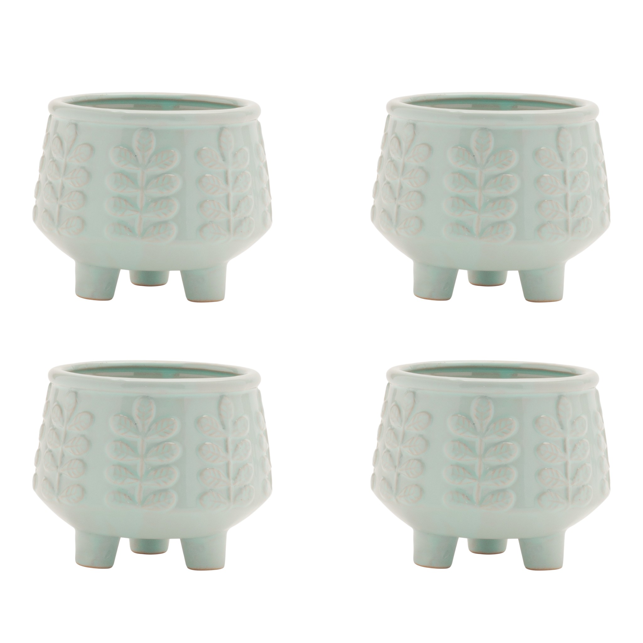 The set of four teal blue ceramic 1 ounce leaf round pot planters brings a pop of color and style to your indoor garden. Crafted from high-quality ceramic, these planters showcase a beautiful teal blue finish that complements any decor. Each round planter is designed with drainage holes, ensuring your plants remain healthy by preventing water accumulation. This set includes four individual planters, making it perfect for arranging your favorite small plants or succulents in a cohesive display. Ideal for brightening up shelves, desks, or windowsills, these charming pots are a delightful addition to your home decor. Elevate your indoor space with this vibrant collection of planters that combine functionality and aesthetic appeal. 4.00-inch h x 4.75-inch w x 4.75-inch d.