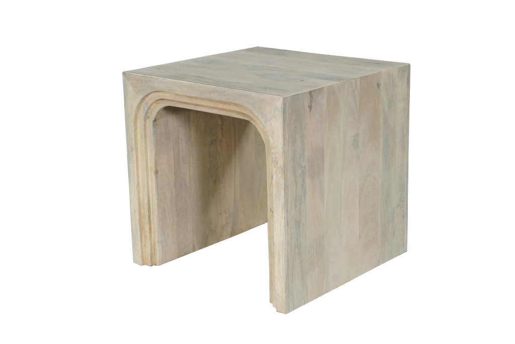 Optimize your space and add some charm to your room with the 24-inch white solid wood square sled end table. This table features quality construction from solid wood with an updated monotone color scheme with white as the main color on both the top and the base. This stylish and unique rectangular table features unique fluted textural layers for visual interest and will be a great location for placing your snacks and drinks, and a place to keep your lamp, frames, or other accessories. This versatile table is a great accent for most any room. 24-inch h x 24-inch w x 24-inch d.