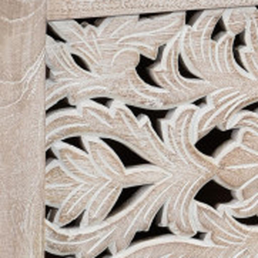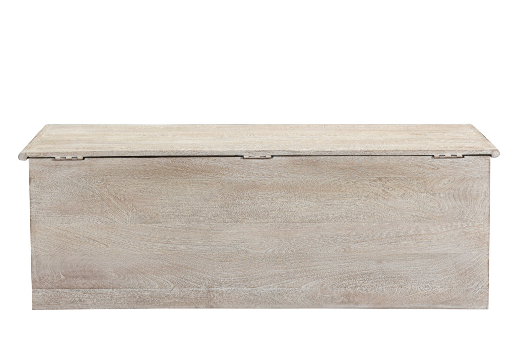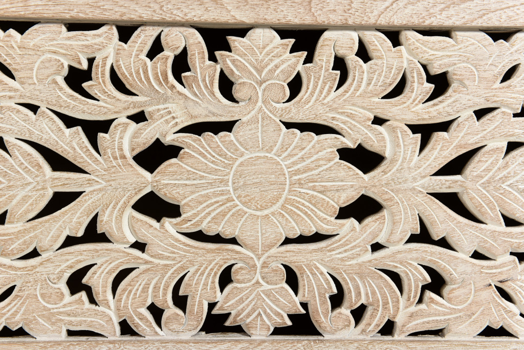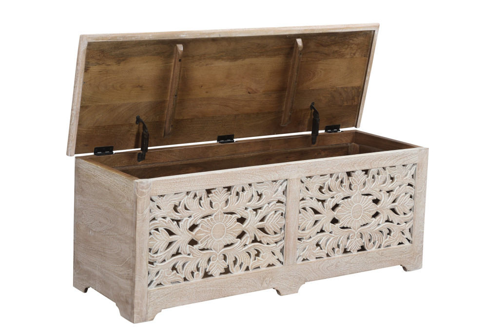 Get ready to relax with this 52-inch white solid wood floral storage ottoman. Designed to discretely add hidden storage to your room without sacrificing style, seating, or foot rest space. This multi-functional piece features quality handcrafted construction from solid mango wood that features a beautiful carved floral design. The purposefully distressed finish gives an authentically rustic feel. This versatile piece is a great way to add storage and functionality to your living room, bedroom, entranceway, hallway, or office. 18-inch h x 52-inch w x 16-inch d.