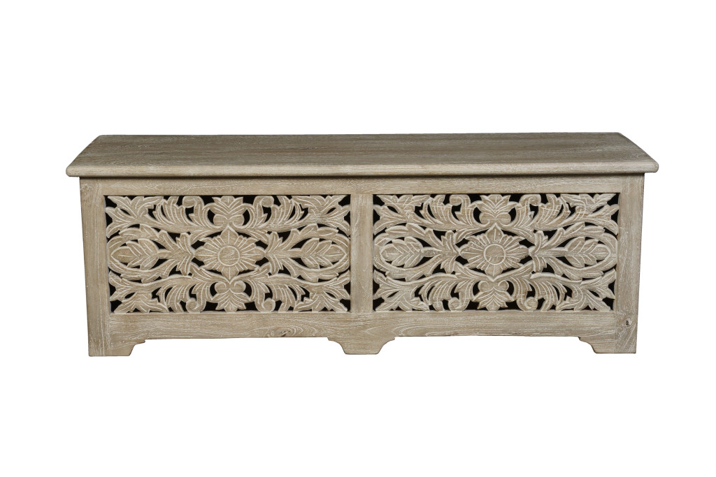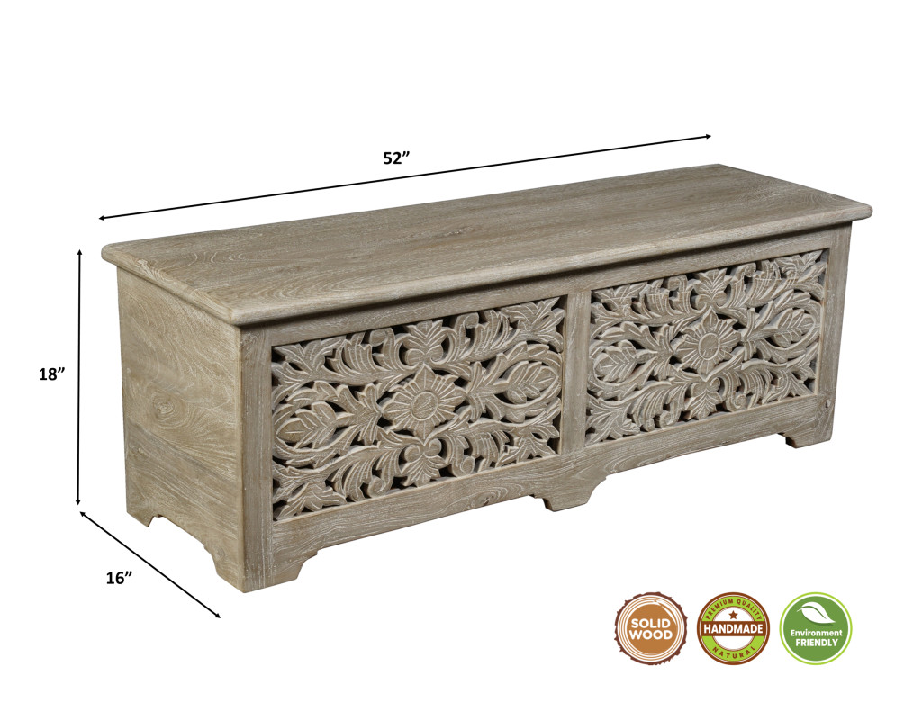 Practicality and fashion mix together with this handy 52-inch gray distressed solid wood carved floral storage ottoman. Designed to discretely add hidden storage to your room without sacrificing style, seating, or foot rest space. This multi-functional piece features quality handcrafted construction from solid mango wood that features a beautiful carved floral design. The purposefully distressed finish gives an authentically rustic feel. This versatile piece is a great way to add storage and functionality to your living room, bedroom, entranceway, hallway, or office. 18-inch h x 52-inch w x 16-inch d.