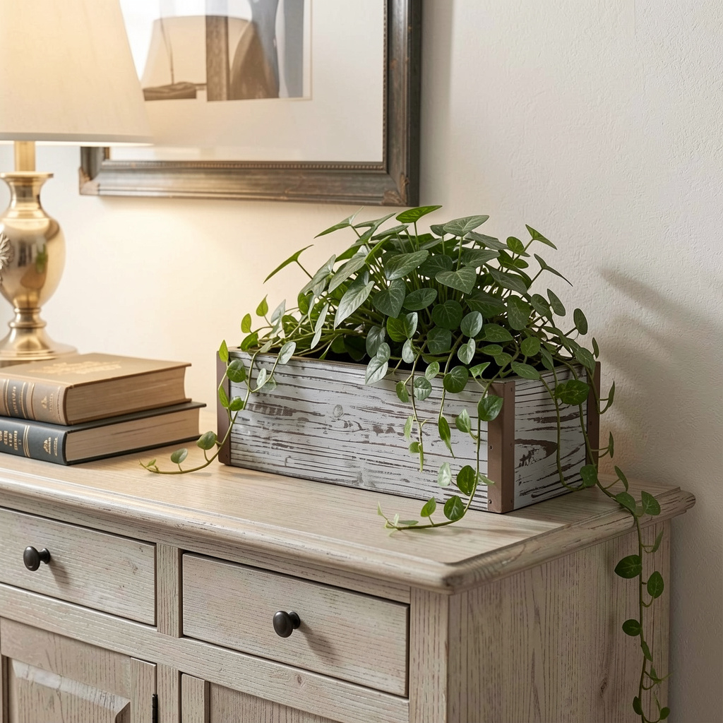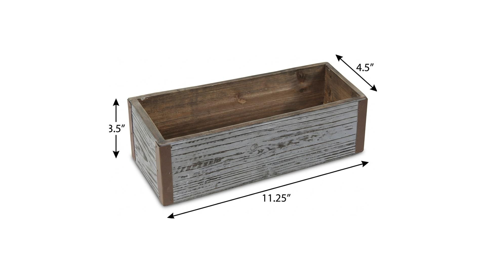 Gray wood 98 ounce rectangular distressed planter box offers a charming way to display your favorite plants. Crafted from durable pine, this planter showcases a rustic aesthetic enhanced by its purposeful coat and paint distressing. The rectangular shape provides ample space for various plant arrangements, making it an ideal choice for both indoor settings and outdoor patios. Its stylish design seamlessly integrates with a range of home decor styles, from farmhouse to contemporary. Create a welcoming atmosphere by adding greenery in this beautifully distressed wooden planter, perfect for enhancing your living space. Enjoy the natural look and feel that this unique planter brings to your home, elevating any corner with its timeless appeal. 3.50-inch h x 11.25-inch w x 4.50-inch d.