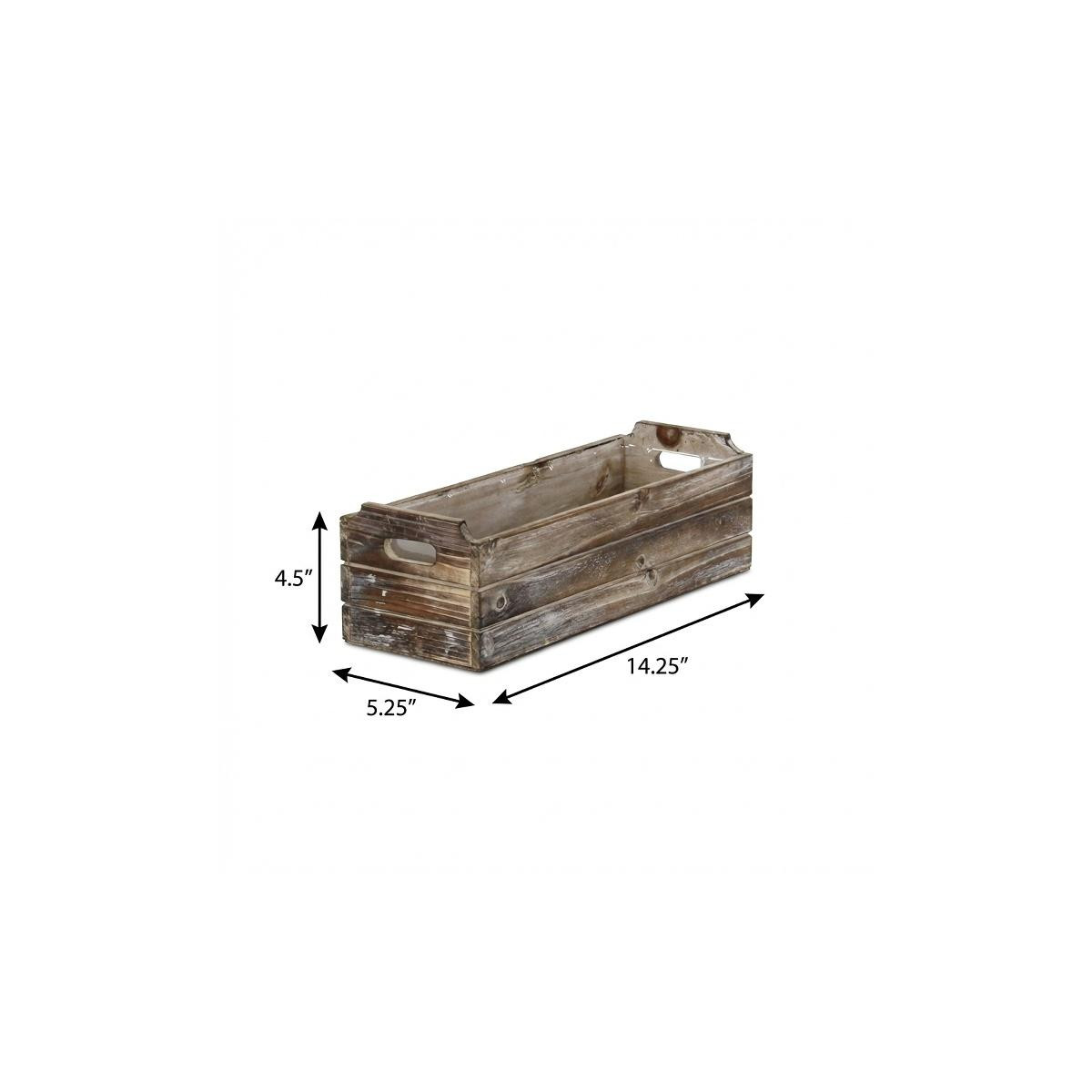 The brown wood 200 ounce rectangular distressed planter box is a charming addition to any indoor space. Crafted from durable pine wood, this planter box showcases a unique rectangular shape that offers ample room for your favorite plants. Its purposeful distressing lends a rustic, weathered look, enhancing the aesthetic appeal of your home decor. Made entirely from wood, this box provides a natural touch while ensuring longevity and stability for plant growth. Perfect for both decorative and functional uses, it can be placed on windowsills, coffee tables, or shelves, bringing a touch of nature indoors. Enhance your living area with this beautiful planter that seamlessly blends style and purpose. 4.50-inch h x 14.25-inch w x 5.25-inch d.
