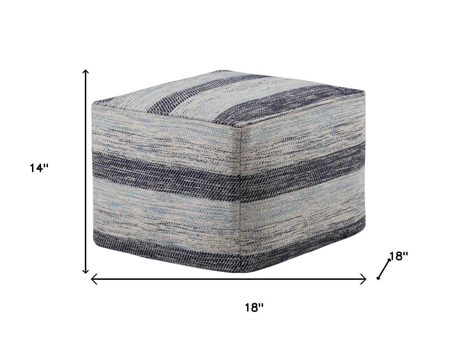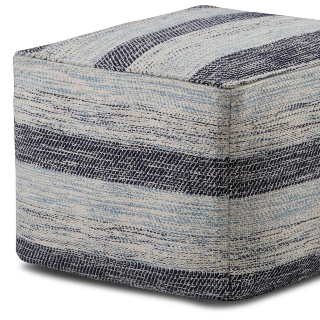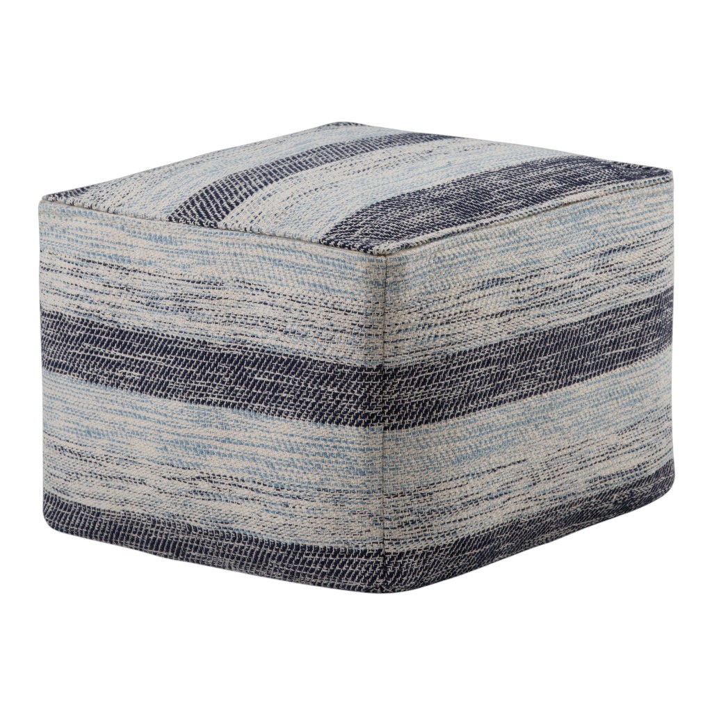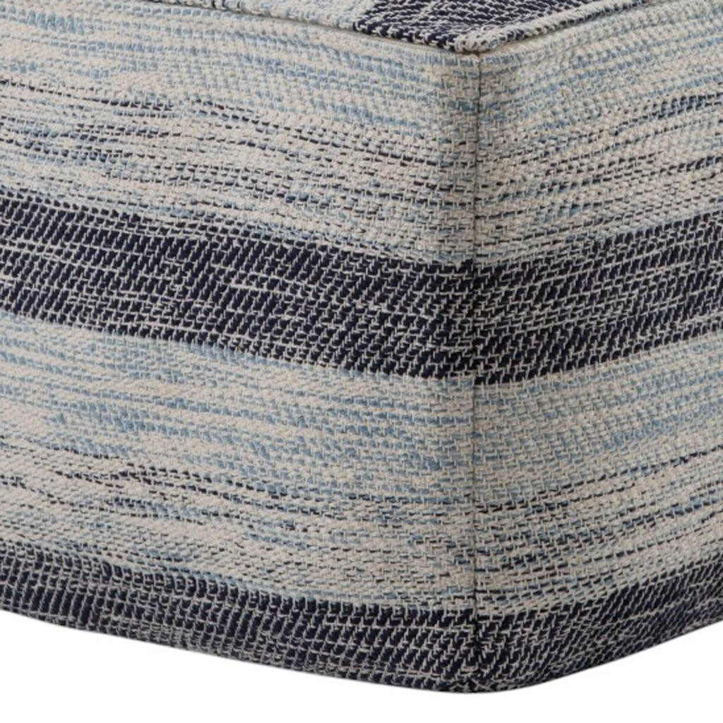 Practicality and fashion mix together with this handy 18-inch dark blue and light blue cotton striped pouf ottoman. Add chic style to your space with this fun pouf that not only looks cool but can be a great foot rest or extra seat when needed. Expertly upholstered with padding and hand woven soft textural cotton in a striped pattern, this ottoman is as comfortable as it is good looking. Easy to blend into most any room, a ottoman is a way to add a good looking accent to your space that can also be practical and useful. 14.00-inch h x 18.00-inch w x 18.00-inch d.