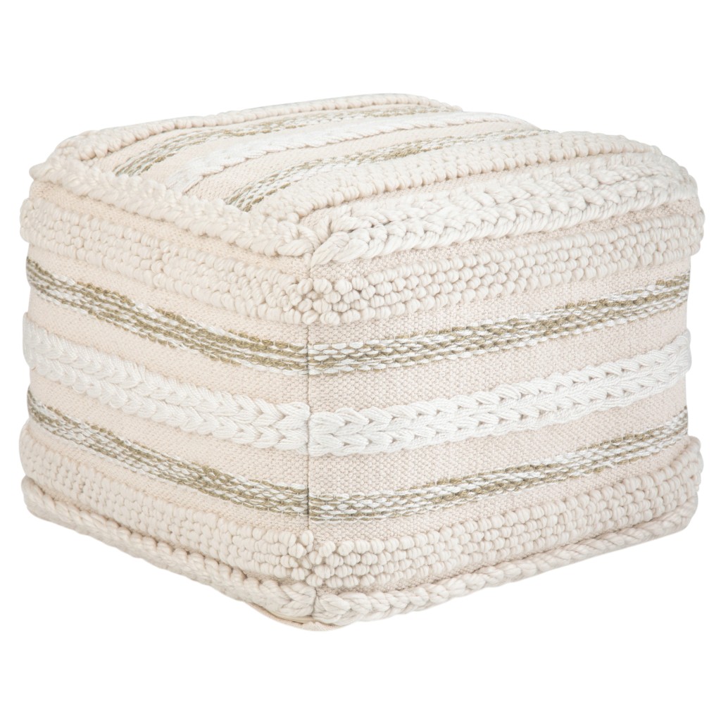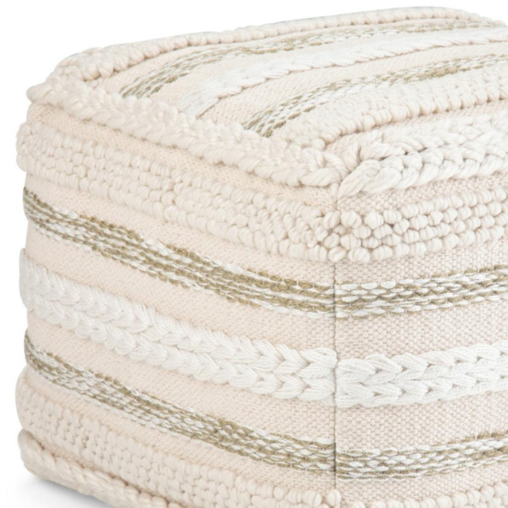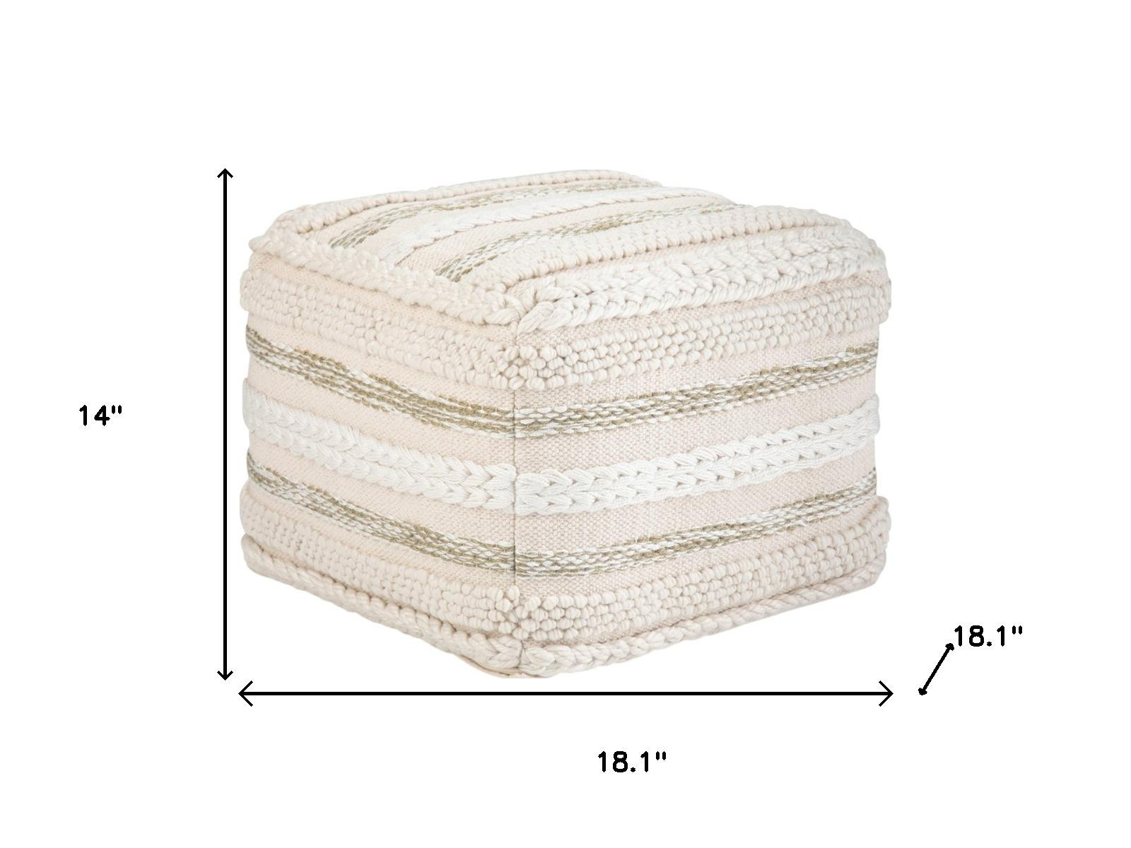 Optimize your space and add some charm to your room with the 18-inch off white cotton pouf ottoman. Add chic style to your space with this fun pouf that not only looks cool but can be a great foot rest or extra seat when needed. The upholstery top of this ottoman is a nice contrast to the upholstery material. Expertly upholstered with padding in a soft solid color cotton, this ottoman is as comfortable as it is good looking. Easy to blend into most any room, a ottoman is a way to add a good looking accent to your space that can also be practical and useful. 14.00-inch h x 18.10-inch w x 18.10-inch d.