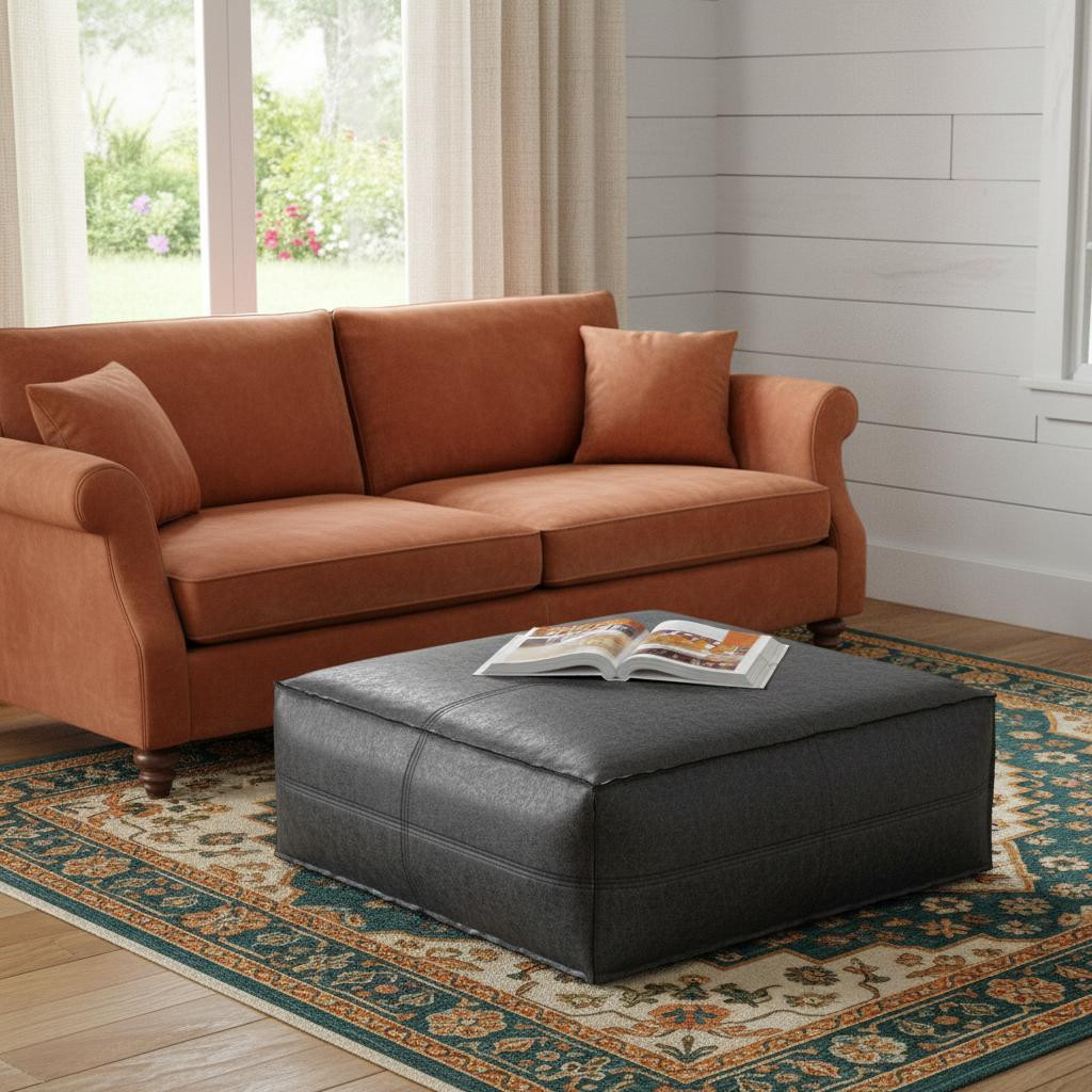 Get ready to relax with this 36-inch black faux leather cocktail ottoman. This chic cocktail ottoman is larger in size and designed to serve as a make-shift coffee table during parties. The surface is wide and flat which is not only suitable for a footrest or seat but also ready to hold trays of appetizers, drinks, or desserts. Complete with a purposefully distressed finish, this ottoman has an aged, vintage, and rustic feel. Expertly upholstered with padding in a soft solid color faux leather, this ottoman is as comfortable as it is good looking. Easy to blend into most any room, a ottoman is a way to add a good looking accent to your space that can also be practical and useful. 14.00-inch h x 36.00-inch w x 36.00-inch d.