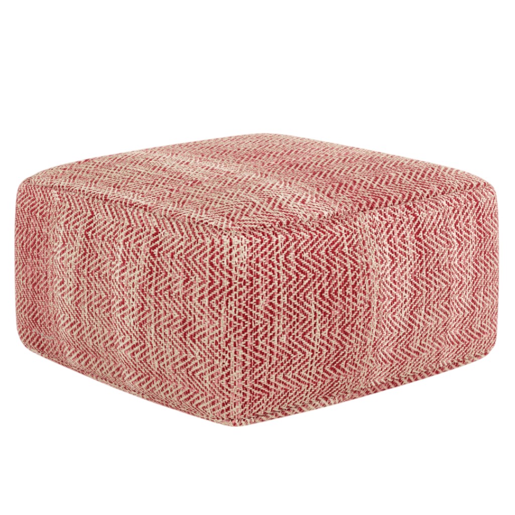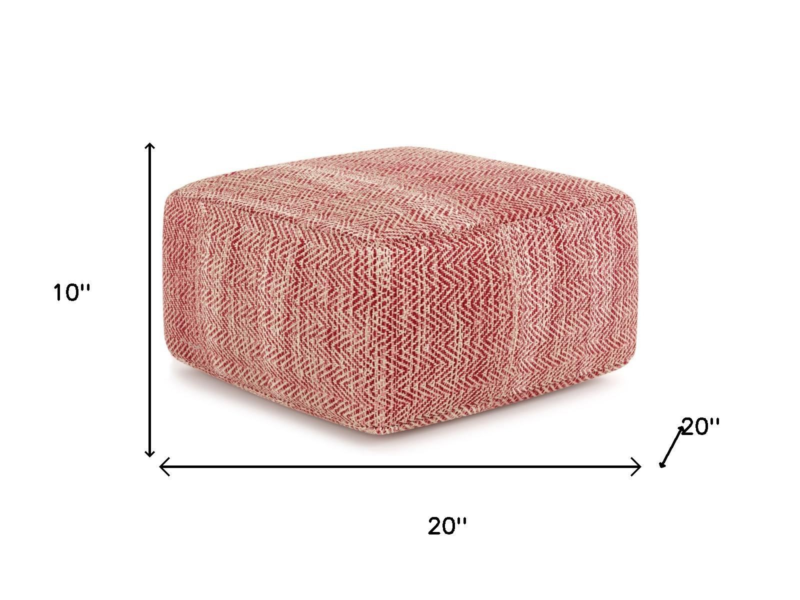 Practicality and fashion mix together with this handy 20-inch red cotton pouf ottoman. Add chic style to your space with this fun pouf that not only looks cool but can be a great foot rest or extra seat when needed. Expertly upholstered with padding in a soft hand woven textural cotton chevron pattern, this ottoman is as comfortable as it is good looking. Ottomans are multi-functional additions to your space that add fashion and practical value. 10.00-inch h x 20.00-inch w x 20.00-inch d.