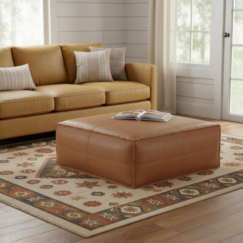 brown faux leather pouf ottoman, faux leather pouf ottoman, leather pouf ottoman, 36" brown faux leather pouf, 36" brown faux leather |