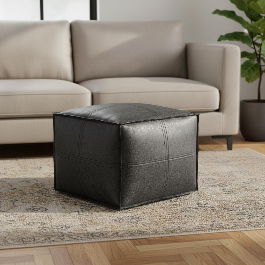 black faux leather pouf ottoman, faux leather pouf ottoman, leather pouf ottoman, 18" black faux leather pouf, 18" black faux leather |