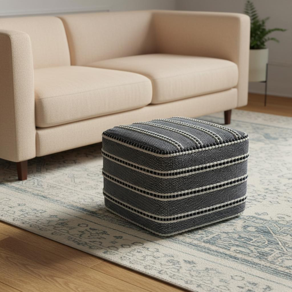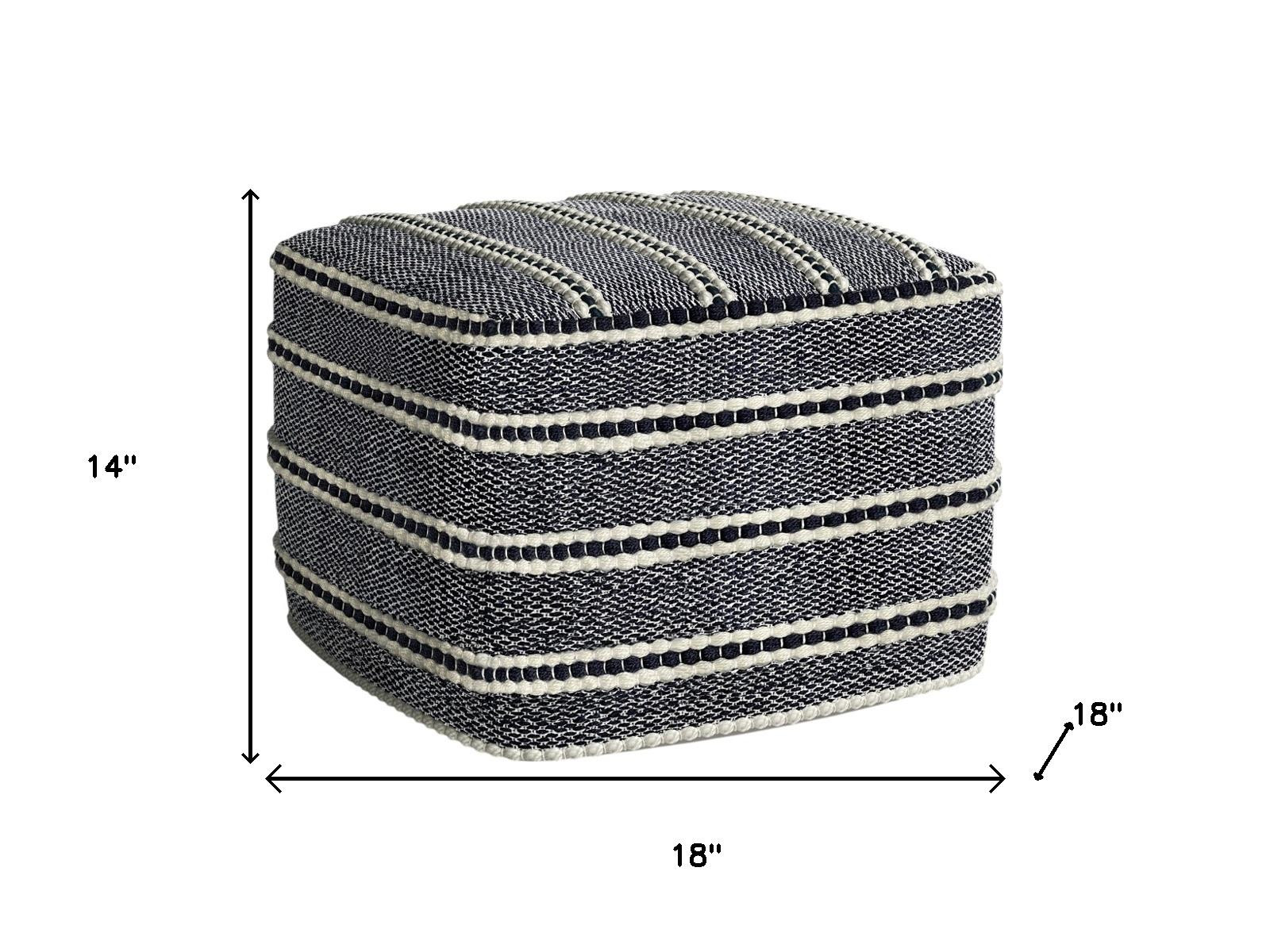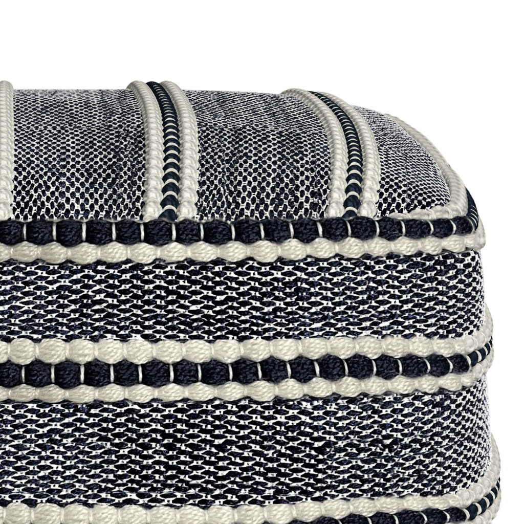 Add a good looking decorative accent to your space that is also practical for seating. Add chic style to your space with this fun pouf that not only looks cool but can be a great foot rest or extra seat when needed. The upholstery top of this ottoman is a nice contrast to the upholstery material. Expertly upholstered with padding in a soft solid color polyester, this ottoman is as comfortable as it is good looking. Easy to blend into most any room, a ottoman is a way to add a good looking accent to your space that can also be practical and useful. 14.00-inch h x 18.00-inch w x 18.00-inch d.
