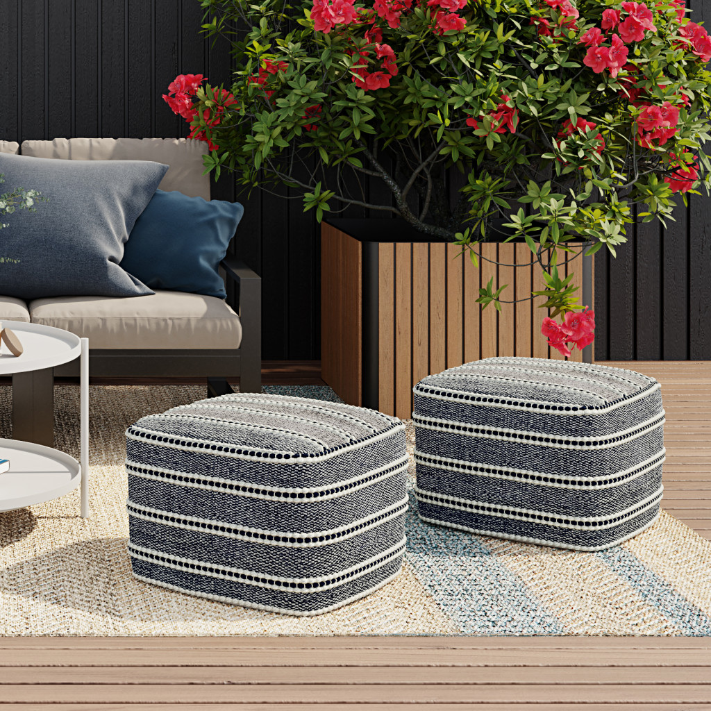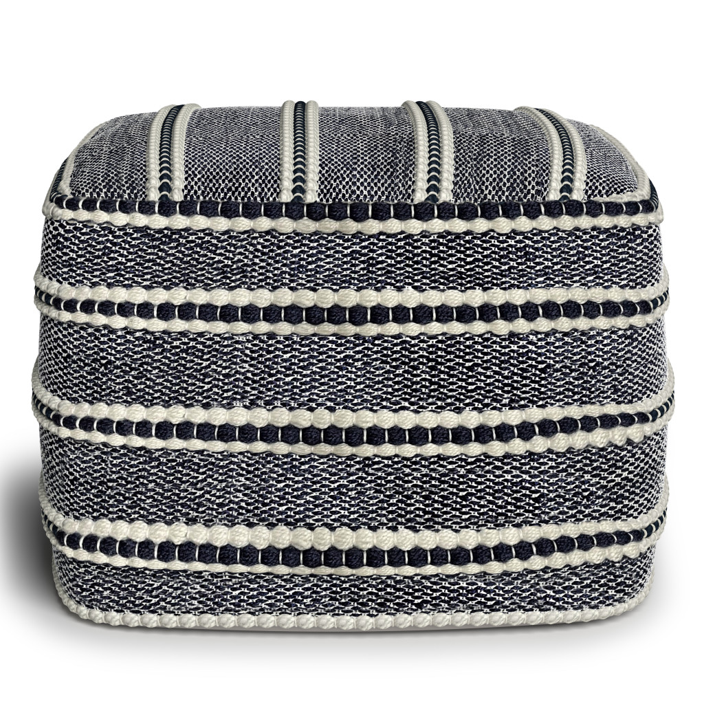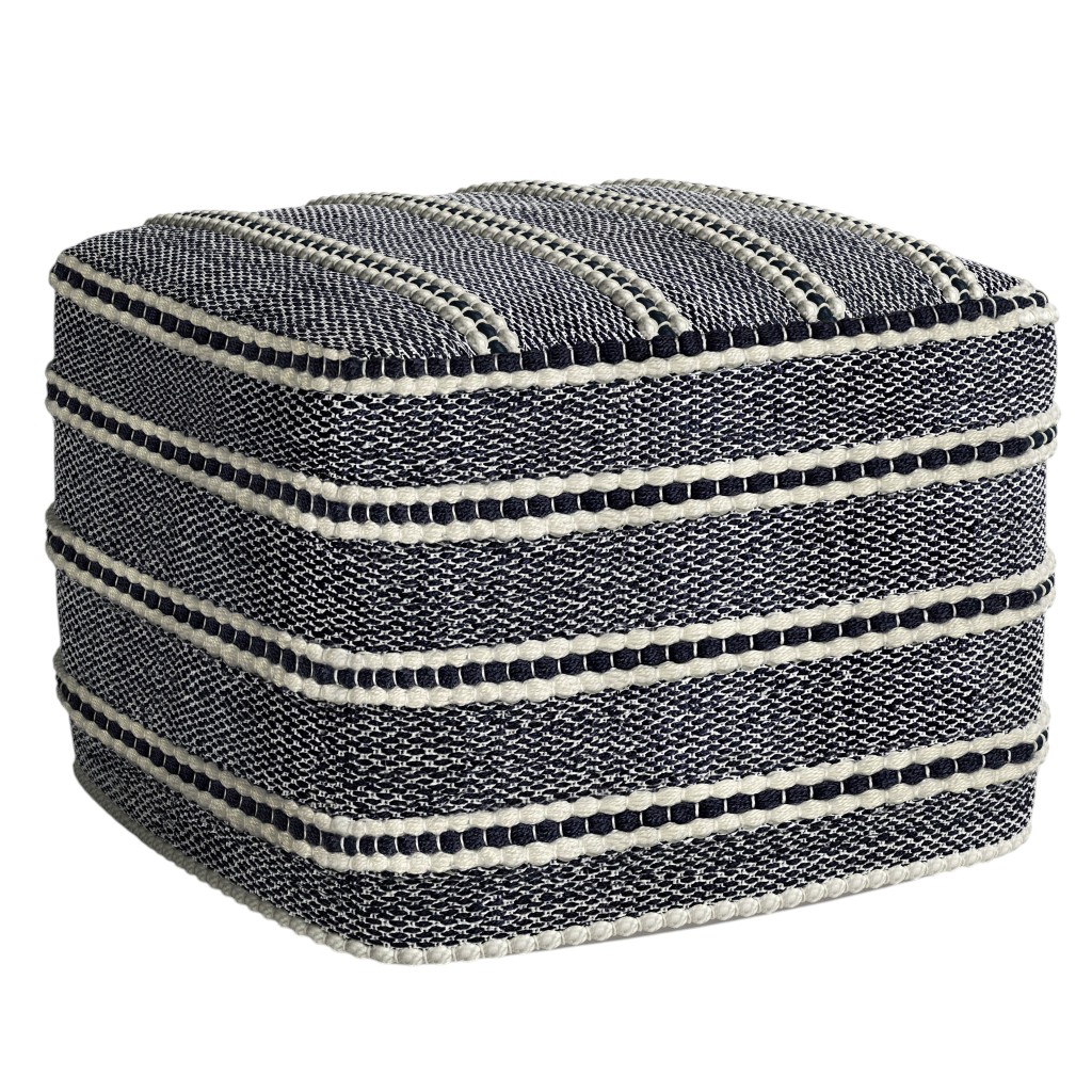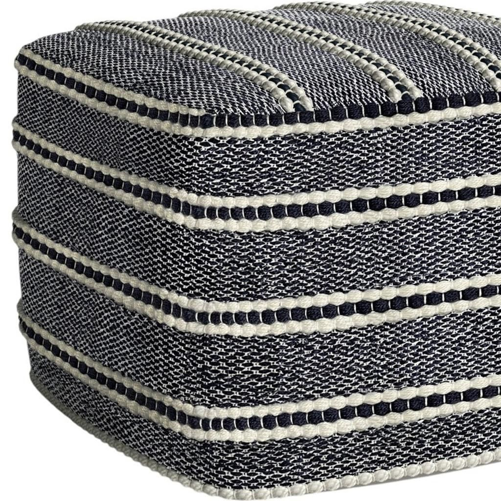 Add a good looking decorative accent to your space that is also practical for seating. Add chic style to your space with this fun pouf that not only looks cool but can be a great foot rest or extra seat when needed. The upholstery top of this ottoman is a nice contrast to the upholstery material. Expertly upholstered with padding in a soft solid color polyester, this ottoman is as comfortable as it is good looking. Easy to blend into most any room, a ottoman is a way to add a good looking accent to your space that can also be practical and useful. 14.00-inch h x 18.00-inch w x 18.00-inch d.