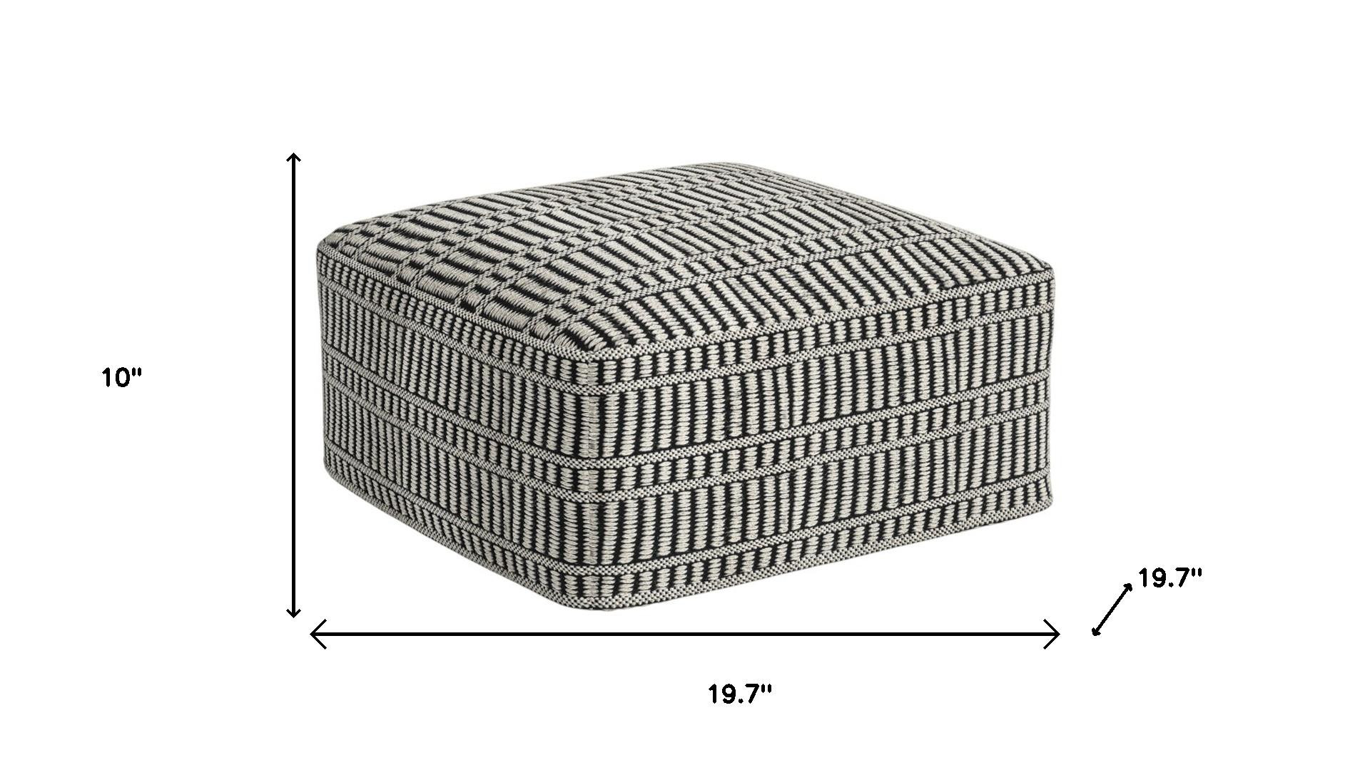 Get ready to relax with this 20-inch black fabric pouf ottoman. Add chic style to your space with this fun pouf that not only looks cool but can be a great foot rest or extra seat when needed. The upholstery top of this ottoman is a nice contrast to the upholstery material. Expertly upholstered with padding in a soft solid color polyester, this ottoman is as comfortable as it is good looking. Easy to blend into most any room, a ottoman is a way to add a good looking accent to your space that can also be practical and useful. 10.00-inch h x 19.70-inch w x 19.70-inch d.