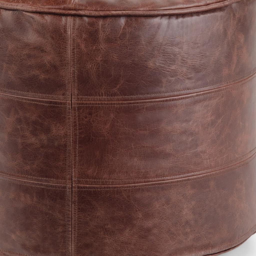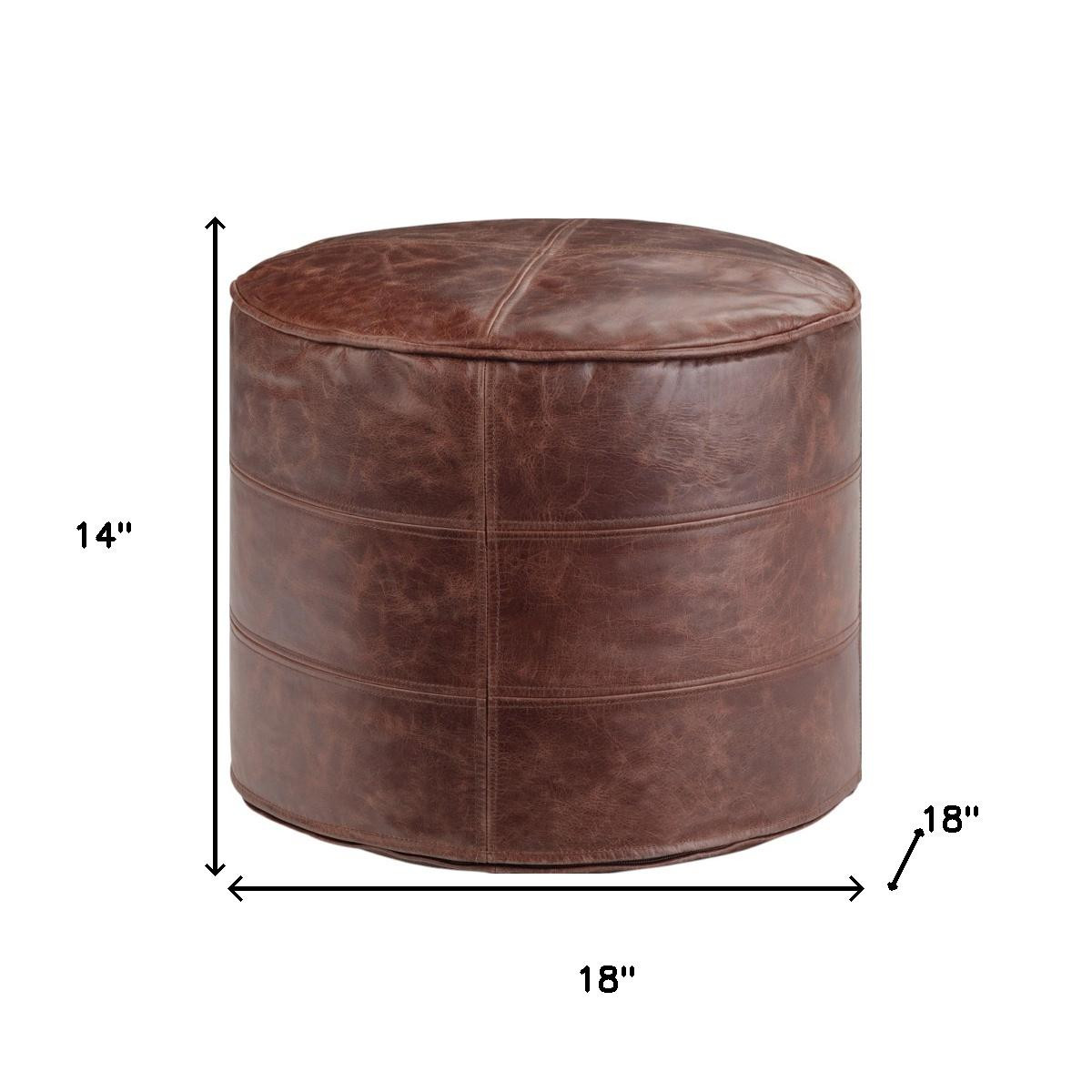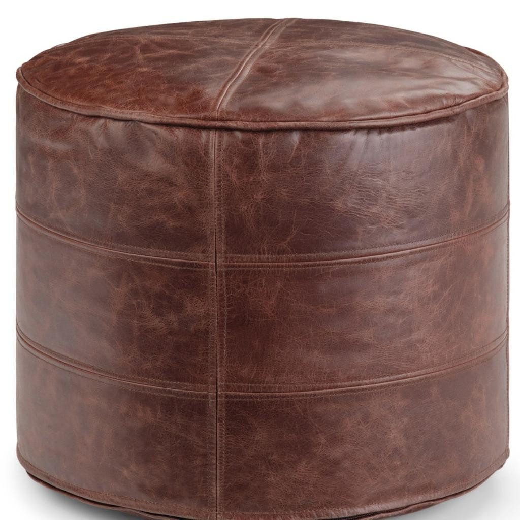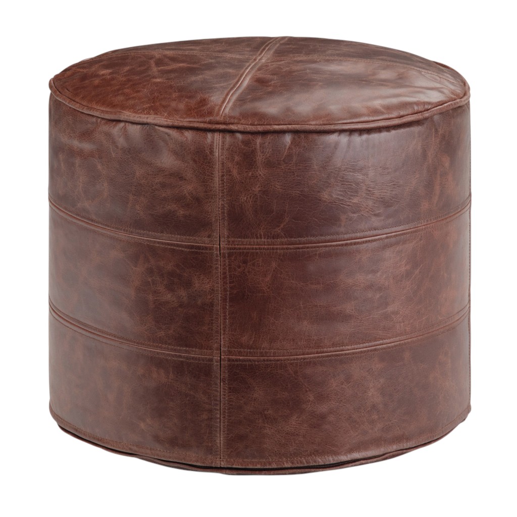 brown leather round pouf ottoman, leather round pouf ottoman, round pouf ottoman, 18" brown leather round pouf, 18" brown leather round |