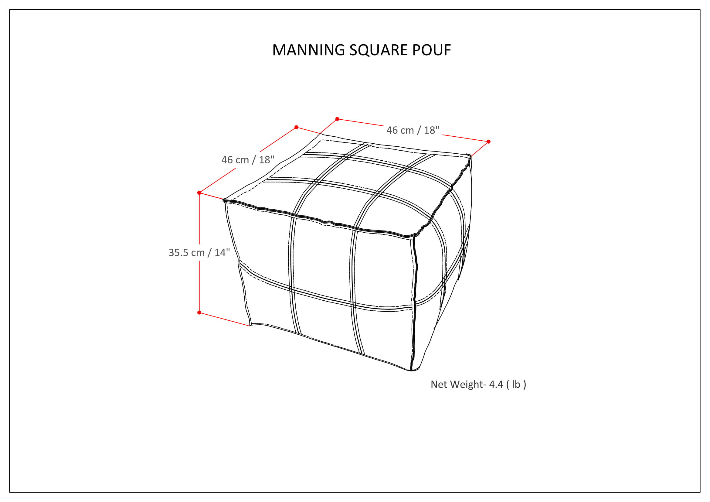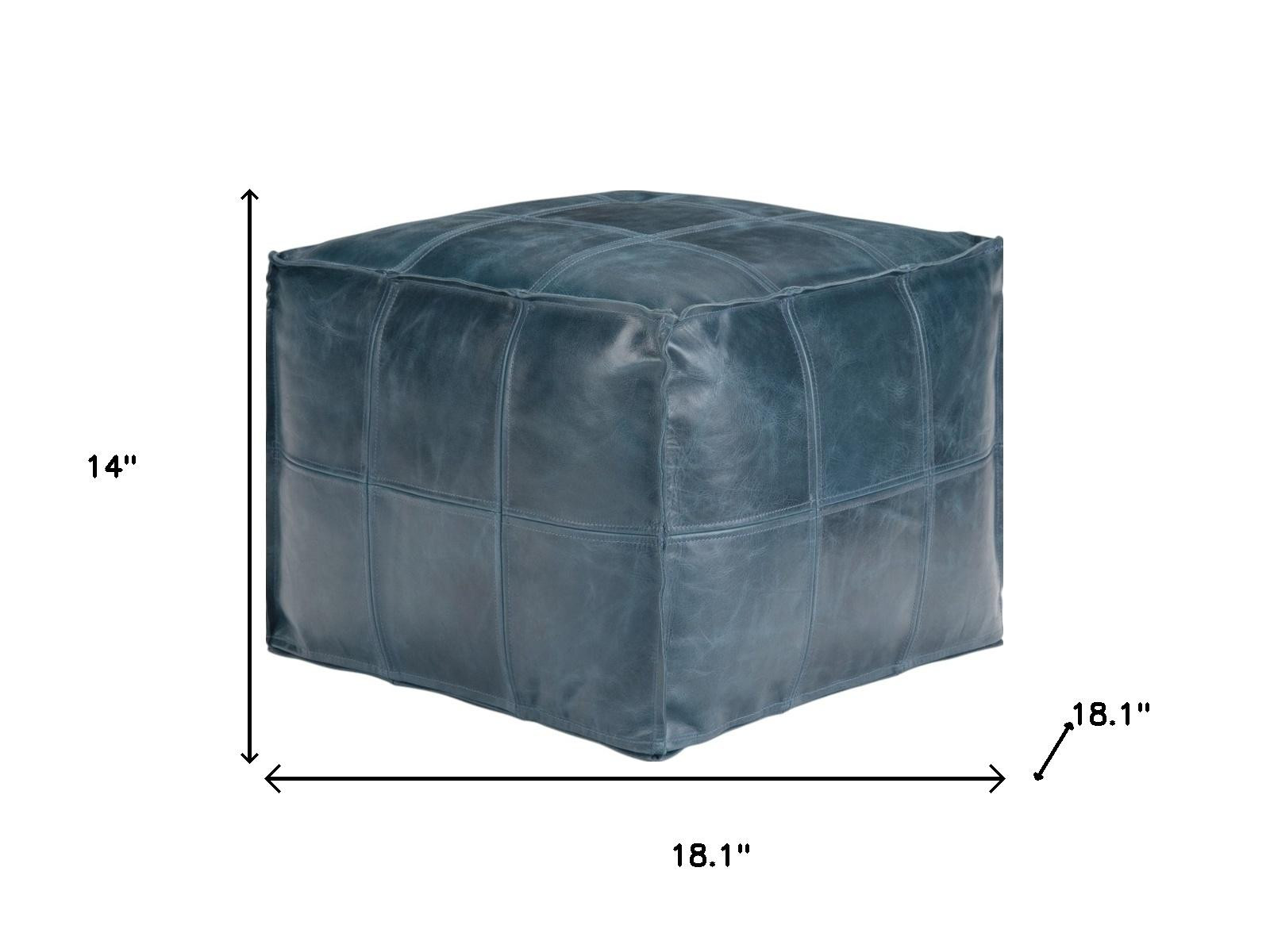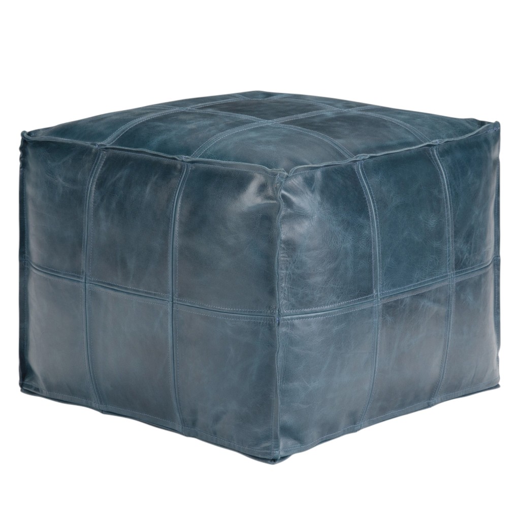 Get ready to relax with this 18-inch blue leather pouf ottoman. Add chic style to your space with this fun pouf that not only looks cool but can be a great foot rest or extra seat when needed. The upholstery top of this ottoman is a nice contrast to the upholstery material. Expertly upholstered with padding in a soft solid color leather, this ottoman is as comfortable as it is good looking. Easy to blend into most any room, a ottoman is a way to add a good looking accent to your space that can also be practical and useful. 14.00-inch h x 18.10-inch w x 18.10-inch d.