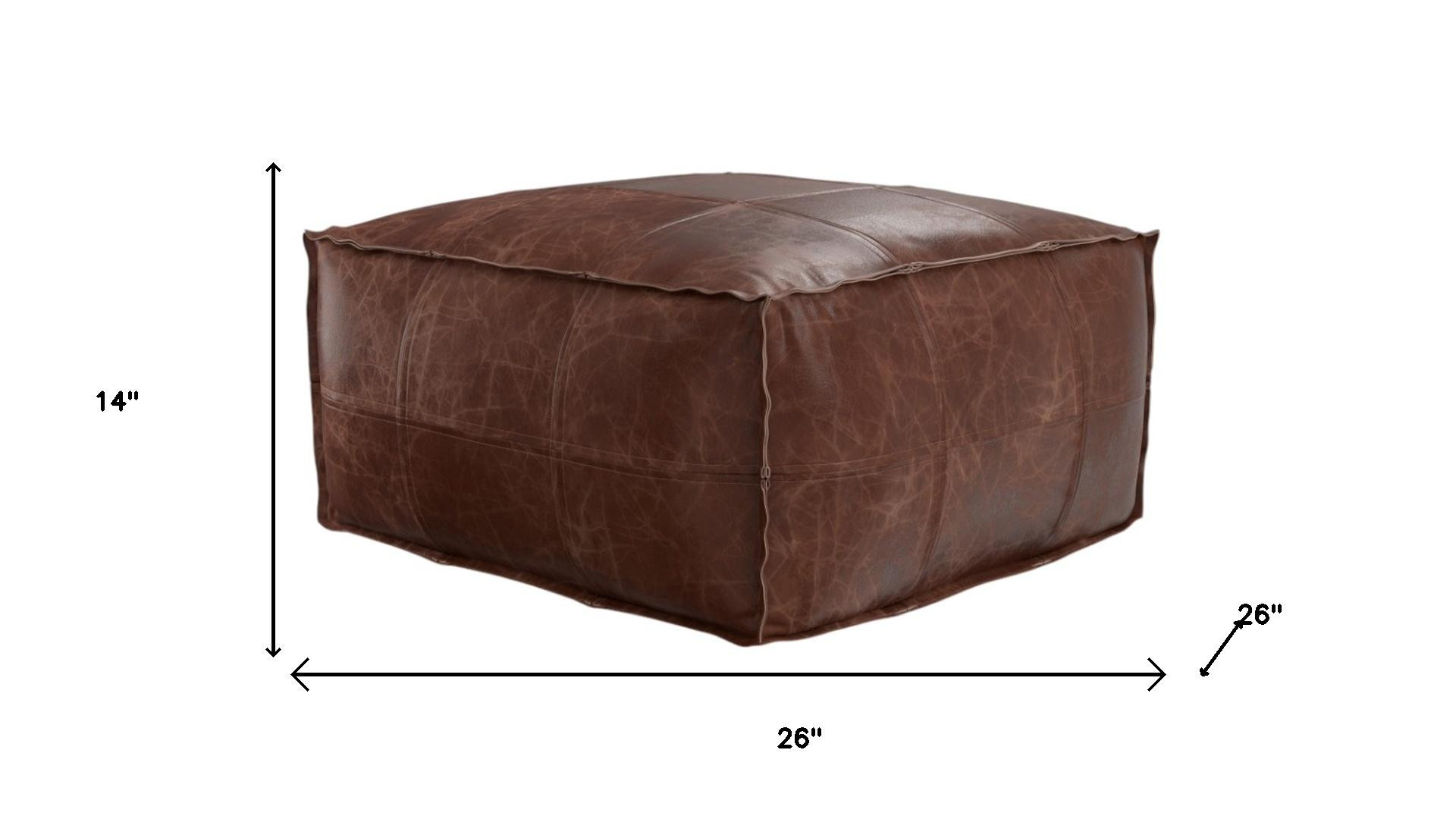 Practicality and fashion mix together with this handy 26-inch brown leather pouf ottoman. Add chic style to your space with this fun pouf that not only looks cool but can be a great foot rest or extra seat when needed. The upholstery top of this ottoman is a nice contrast to the upholstery material. Expertly upholstered with padding in a soft solid color leather, this ottoman is as comfortable as it is good looking. Easy to blend into most any room, a ottoman is a way to add a good looking accent to your space that can also be practical and useful. 14.00-inch h x 26.00-inch w x 26.00-inch d.