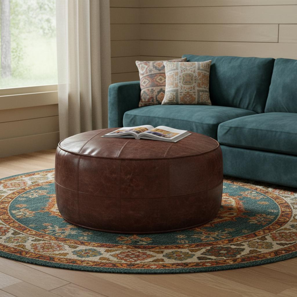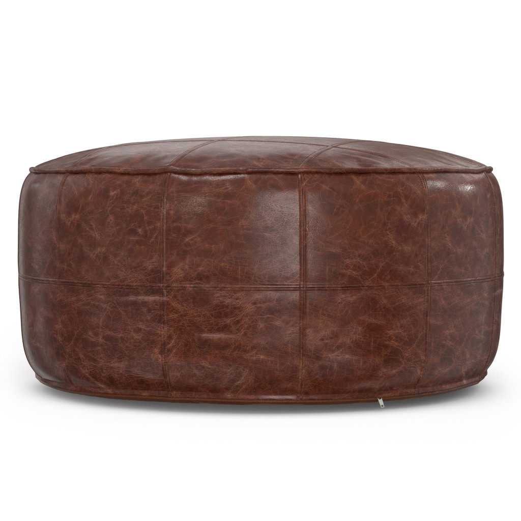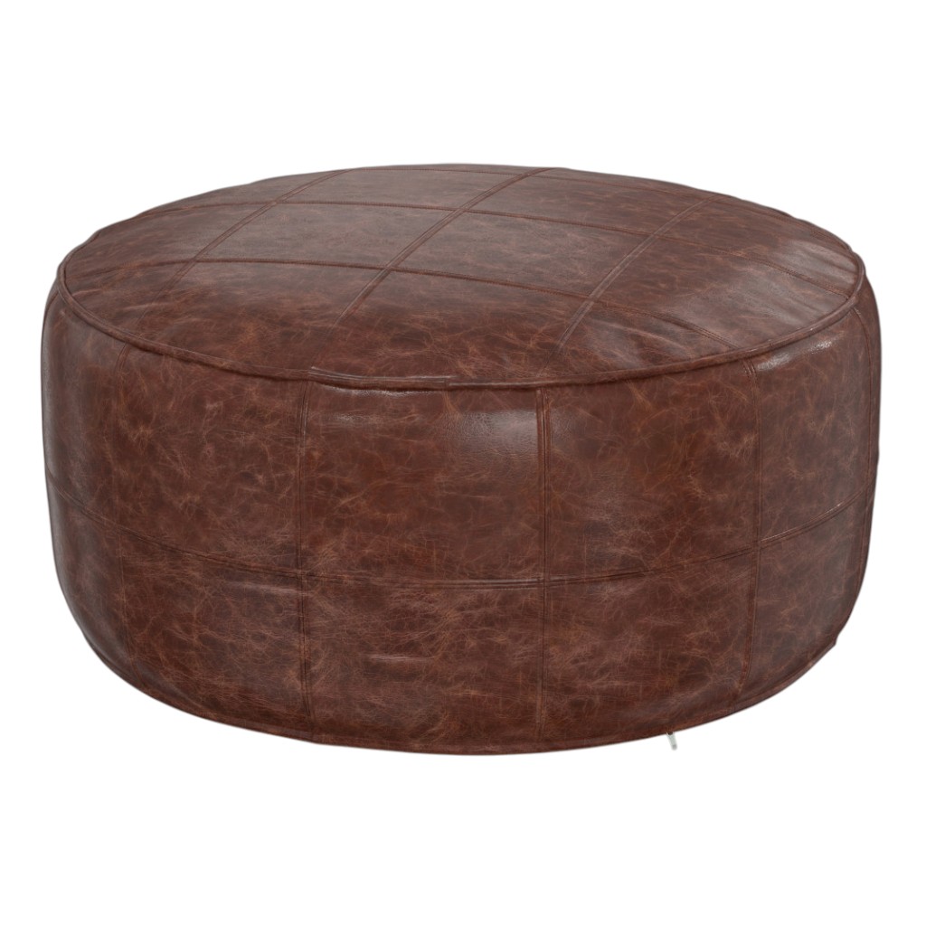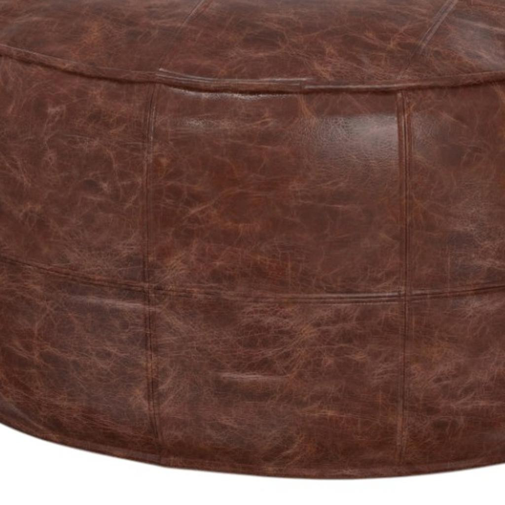 brown leather round pouf ottoman, leather round pouf ottoman, round pouf ottoman, 34" brown leather round pouf, 34" brown leather round |