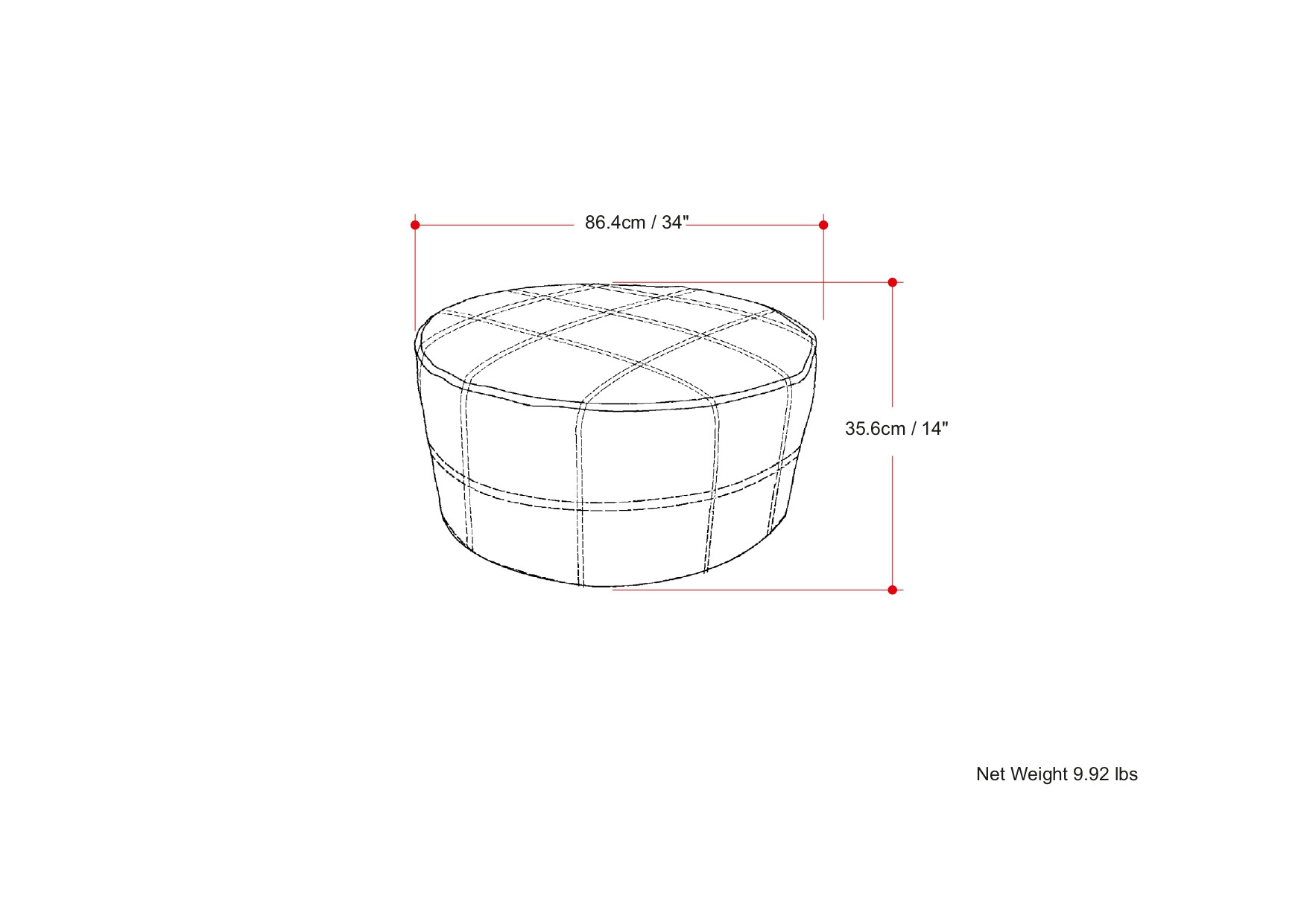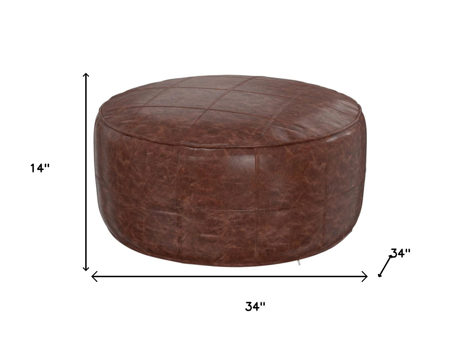 Get ready to relax with this 34-inch brown leather round pouf ottoman. Add chic style to your space with this fun pouf that not only looks cool but can be a great foot rest or extra seat when needed. The upholstery top of this ottoman is a nice contrast to the upholstery material. Expertly upholstered with padding in a soft solid color leather, this ottoman is as comfortable as it is good looking. Ottomans are multi-functional additions to your space that add fashion and practical value. 14.00-inch h x 34.00-inch w x 34.00-inch d.