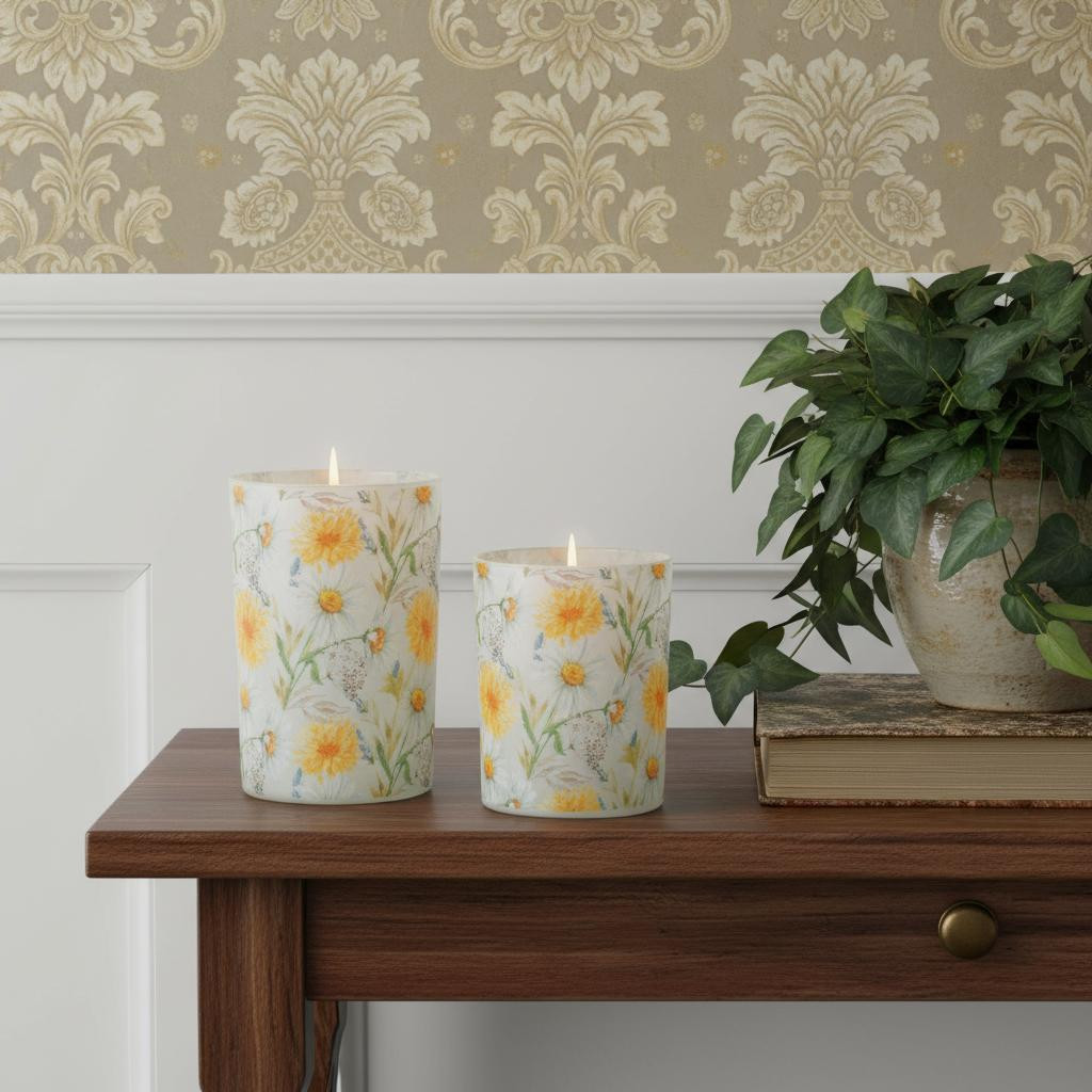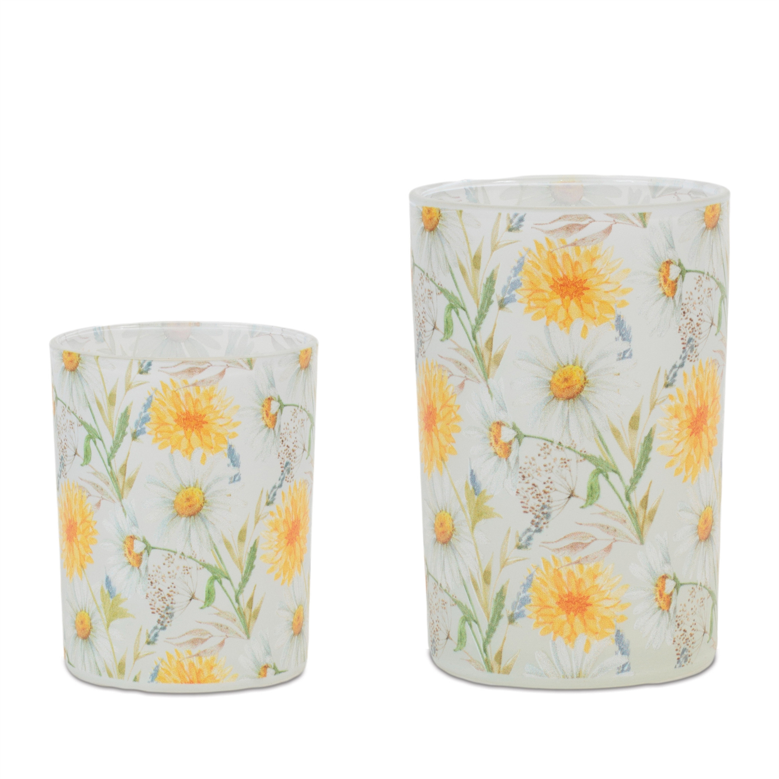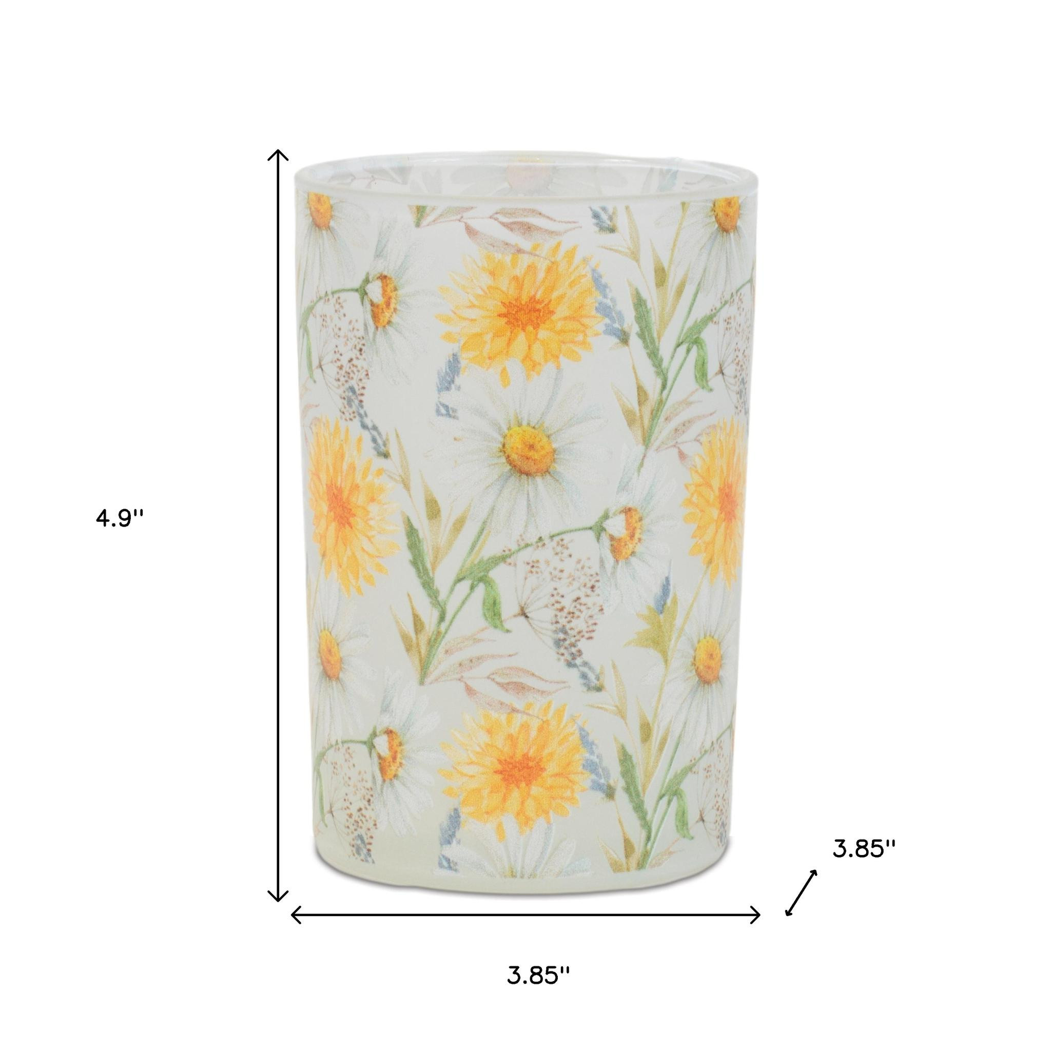 Create a warm and inviting environment in any space with this set of two yellow and green floral glass tabletop pillar candle holders. Sold as a set of 2, this candleholder gives your space radiant illumination. Dress up your home to impress every season with this fabulous candleholder. Candleholders are a decorative accent on their own. With our without candles. 4.90-inch h x 3.85-inch w x 3.85-inch d.