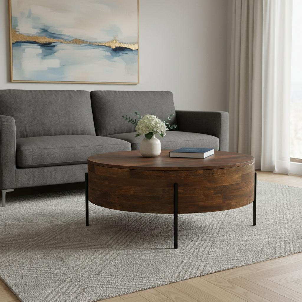 This stylish 38-inch brown solid wood round solid coffee table is not only practical, but good looking and built to last. This table features quality construction from solid wood and an updated monotone color scheme with brown as the main color on both the top and the base. It has an attractive design that will definitely breathe some fresh air into your interior. 14.00-inch h x 38.00-inch w x 38.00-inch d.