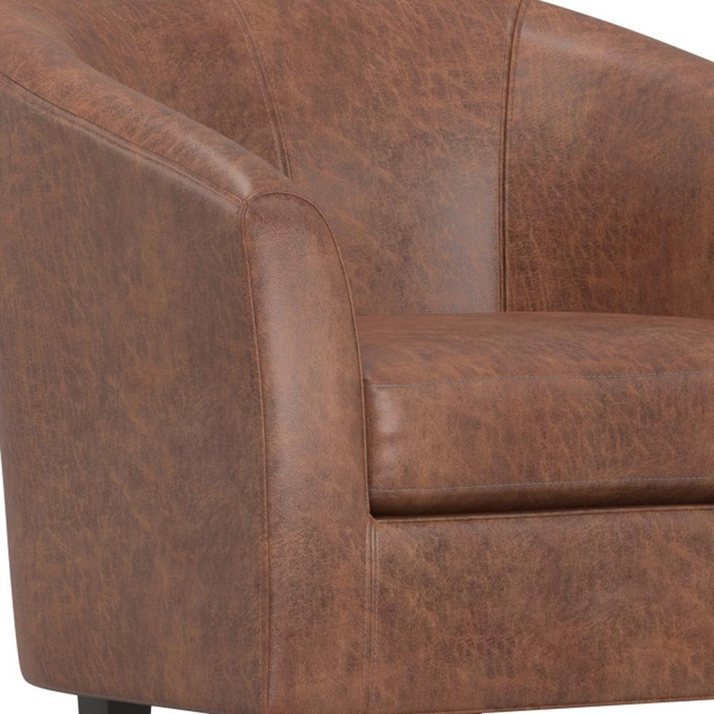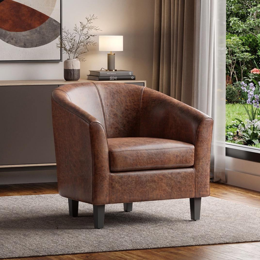 Add an air of fashion to your room and rejuvenate the space with this 30-inch brown and dark brown leather arm chair. This sturdy leather upholstered arm chair comes in a chic solid brown color to give your space just the right look. Giving the chair stability and structure, the inner frame is constructed with high quality manufactured wood, includes comfy armrests, and features a fixed back that comes complete with soft and comfortable cushioning. 30.30-inch h x 29.90-inch w x 28.00-inch d.