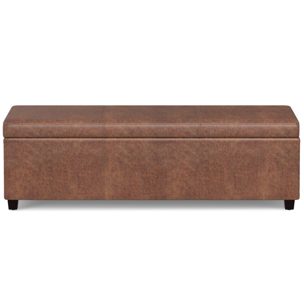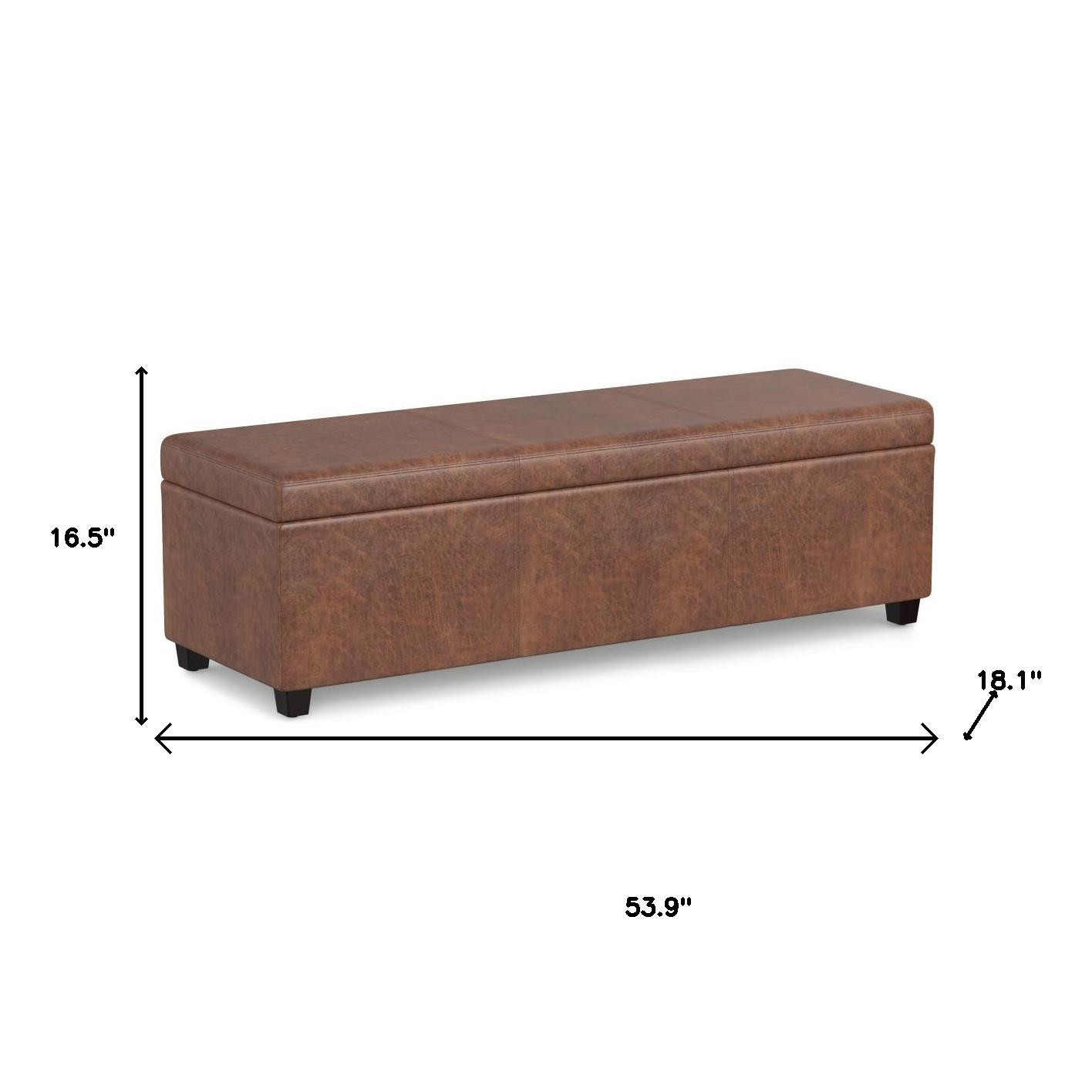Get ready to relax with this 54-inch dark brown and brown upholstery storage ottoman. Designed to discretely add hidden storage to your room without sacrificing seating or foot rest space. Easy to blend into most any room, a ottoman is a way to add a good looking accent to your space that can also be practical and useful. 16.50-inch h x 53.90-inch w x 18.10-inch d.
