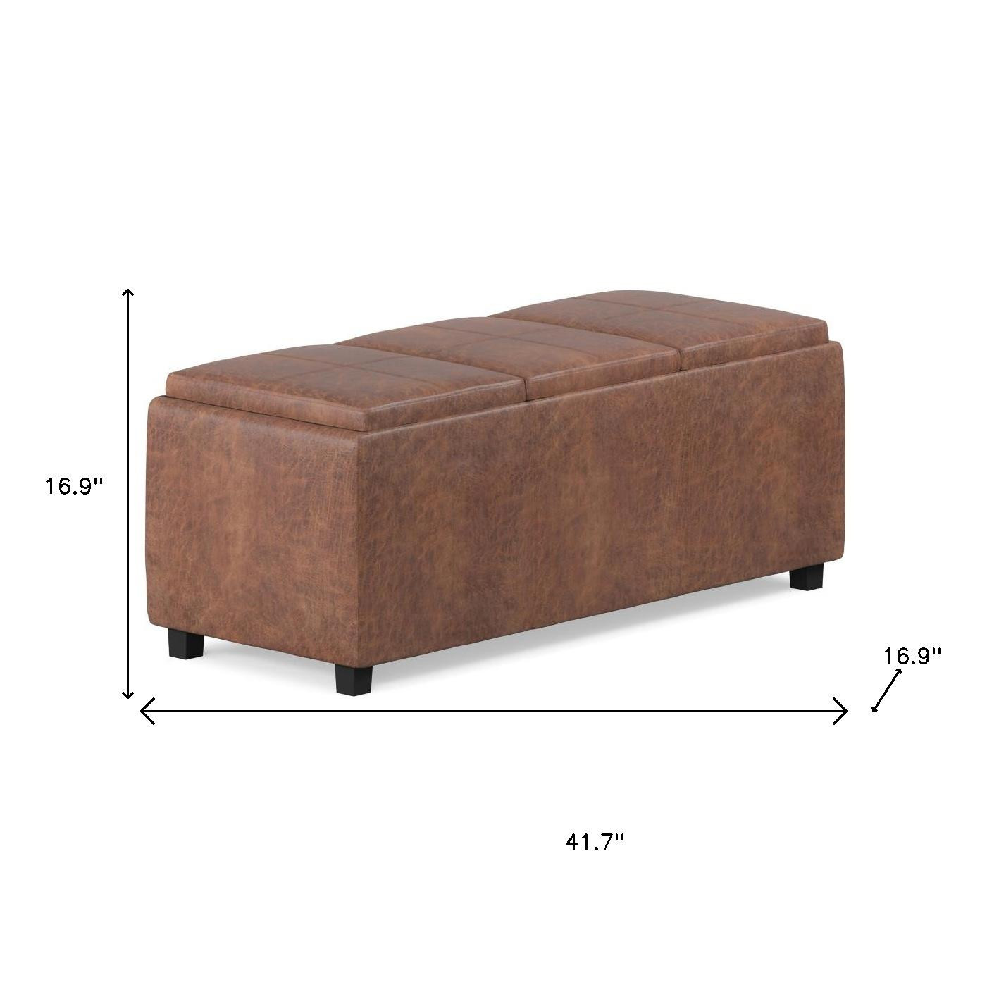 Practicality and fashion mix together with this handy 42-inch dark brown and brown upholstery storage ottoman. Designed to discretely add hidden storage to your room without sacrificing seating or foot rest space. This multi-function ottoman features a cabinet area in addition to seating to help keep your space neat and tidy. Ottomans are multi-functional additions to your space that add fashion and practical value. 16.90-inch h x 41.70-inch w x 16.90-inch d.