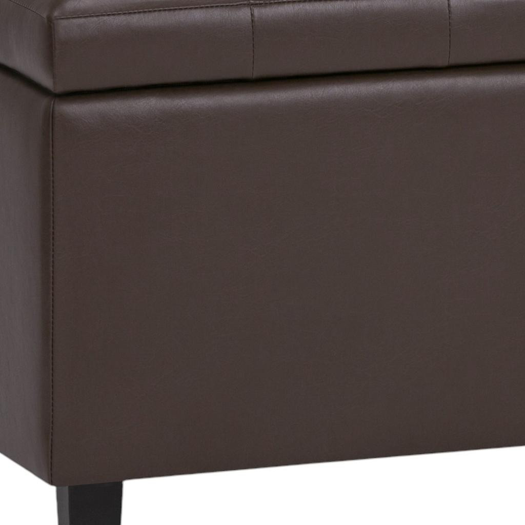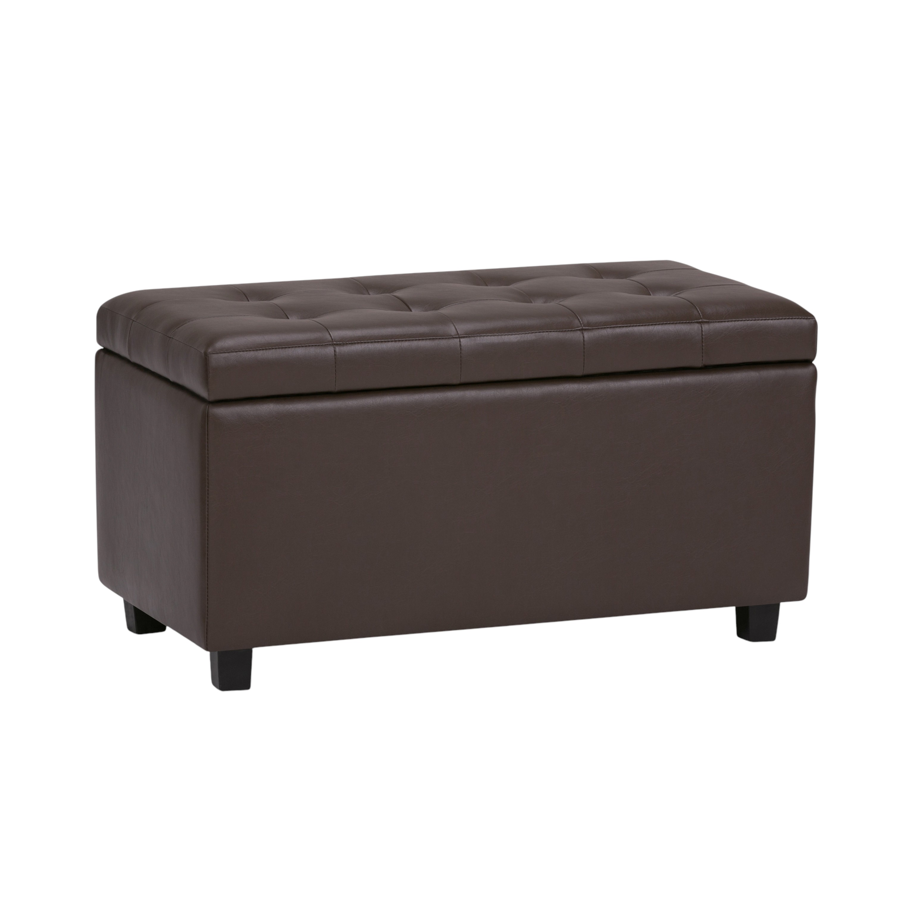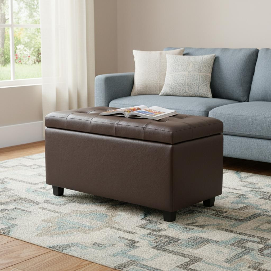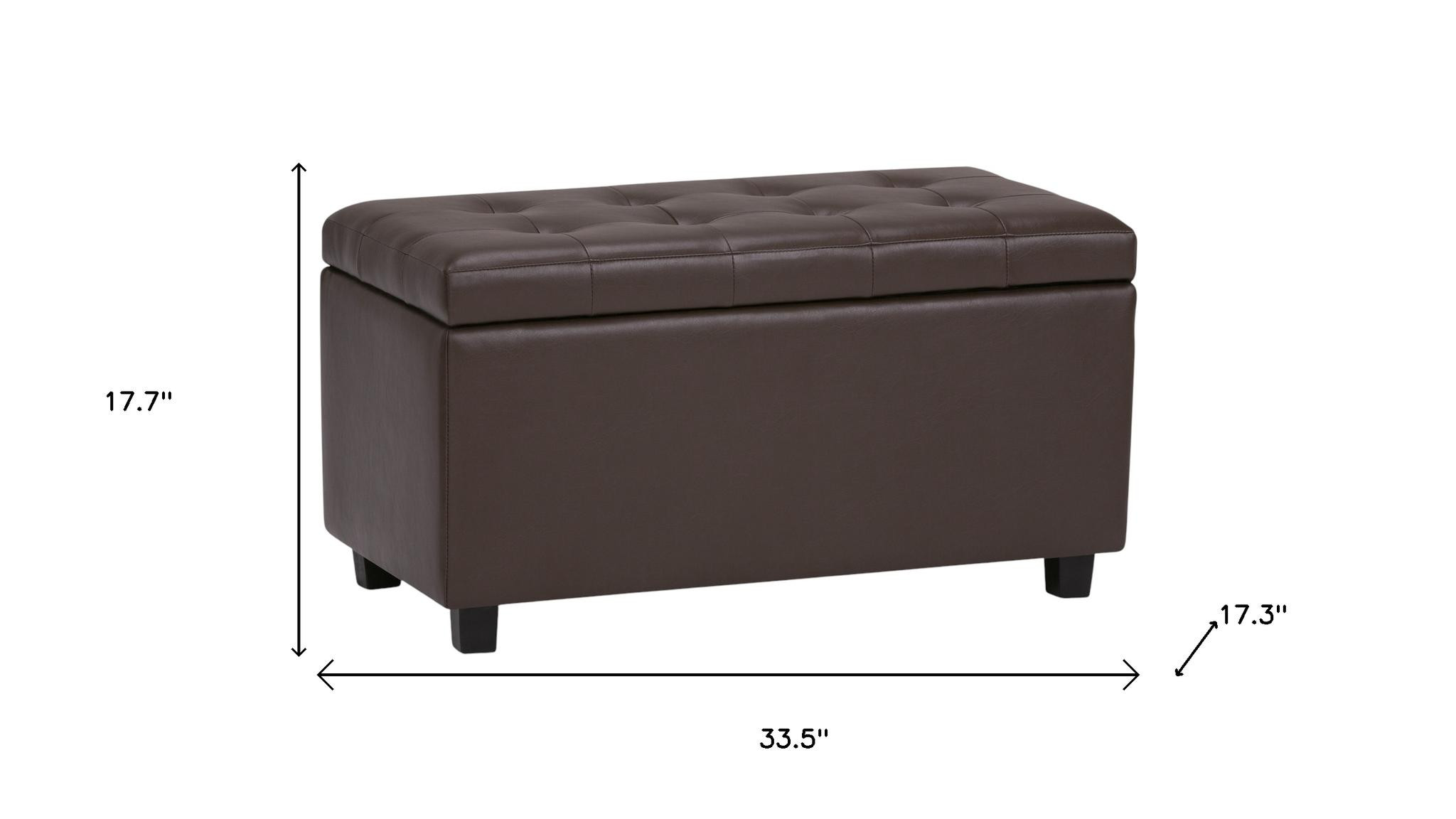 Practicality and fashion mix together with this handy 34-inch dark brown and chocolate upholstery storage ottoman. Designed to discretely add hidden storage to your room without sacrificing seating or foot rest space. Ottomans are multi-functional additions to your space that add fashion and practical value. 17.70-inch h x 33.50-inch w x 17.30-inch d.