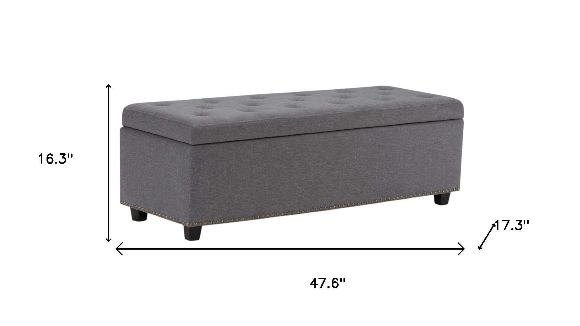 Get ready to relax with this 48-inch dark brown and slate gray upholstery storage ottoman. Designed to discretely add hidden storage to your room without sacrificing seating or foot rest space. Easy to blend into most any room, a ottoman is a way to add a good looking accent to your space that can also be practical and useful. 16.30-inch h x 47.60-inch w x 17.30-inch d.