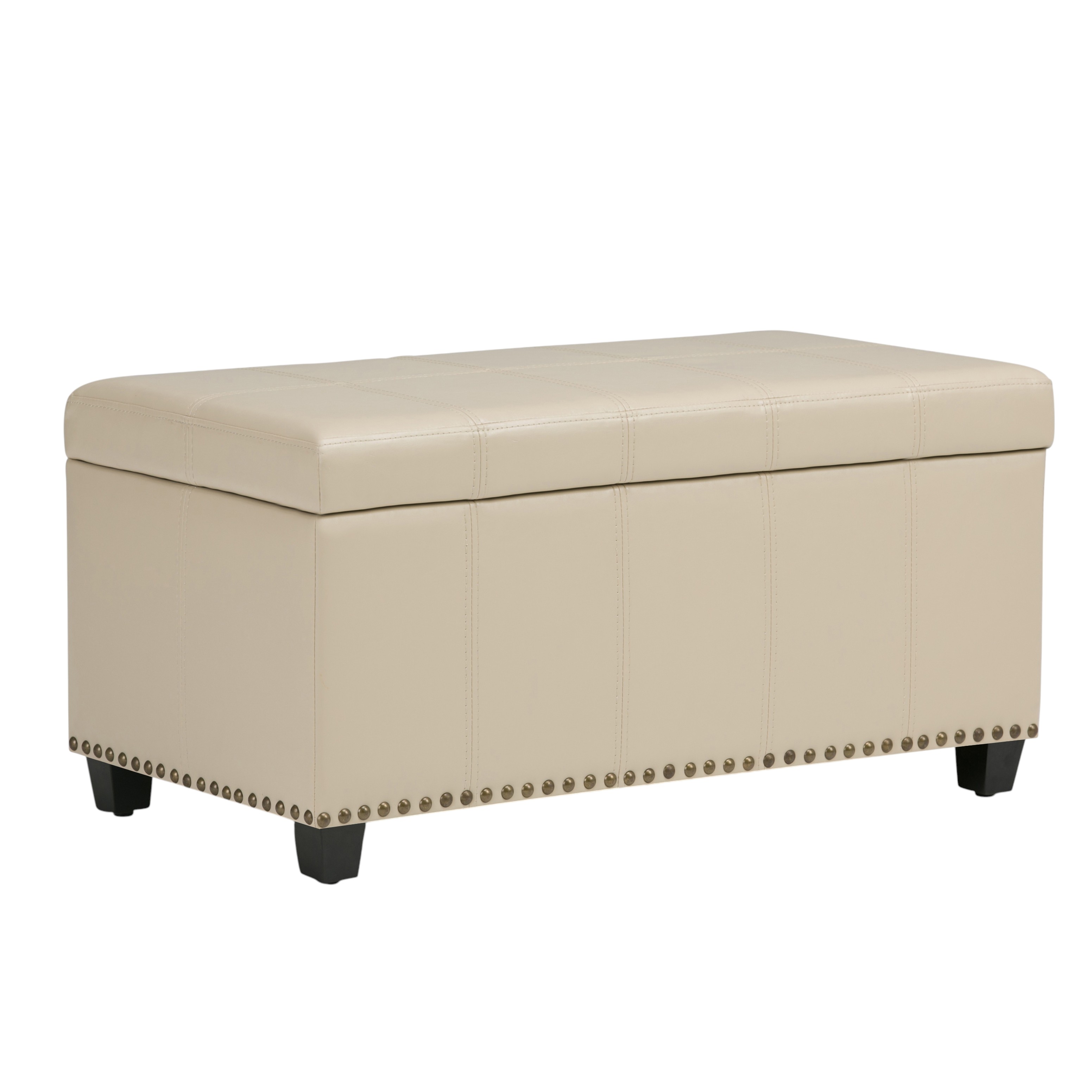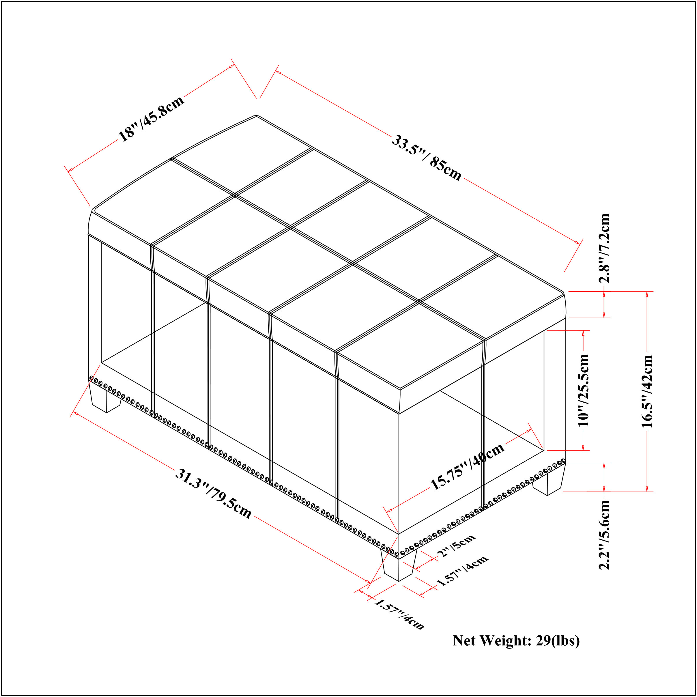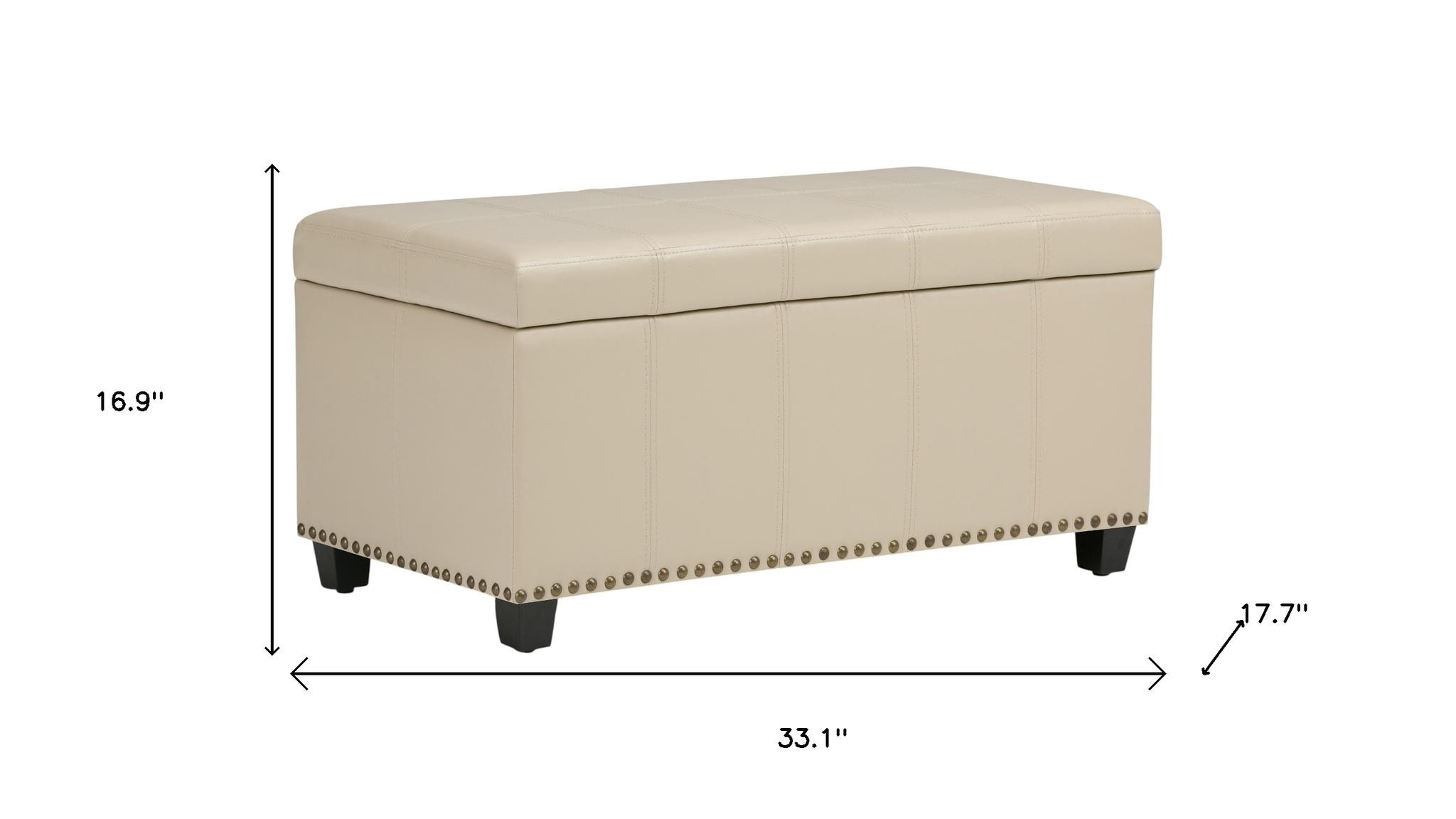 Practicality and fashion mix together with this handy 33-inch espresso and cream upholstery storage ottoman. Designed to discretely add hidden storage to your room without sacrificing seating or foot rest space. Easy to blend into most any room, a ottoman is a way to add a good looking accent to your space that can also be practical and useful. 16.90-inch h x 33.10-inch w x 17.70-inch d.