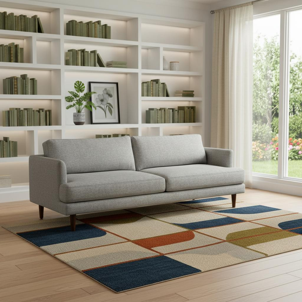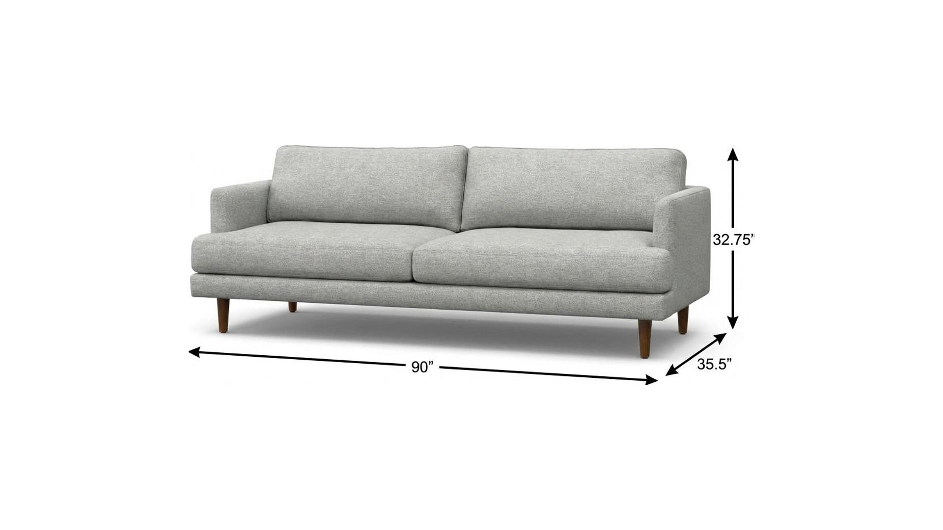 Add an air of fashion to your space with this fabulous 90-inch gray fabric sofa with brown legs. Solid colors give you lots of decorative options and are easy to work into your decor scheme. Web suspension construction gives this piece strong support and makes it comfortable to sit even for long periods of time. Removable back cushions make this sofa easy to manage. Fixed arms offer a comfy place to rest. Built to last, this sofa will be a great centerpiece for your room. 32.75-inch h x 90.00-inch w x 35.50-inch d.