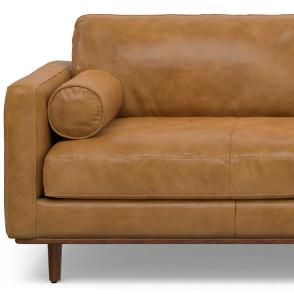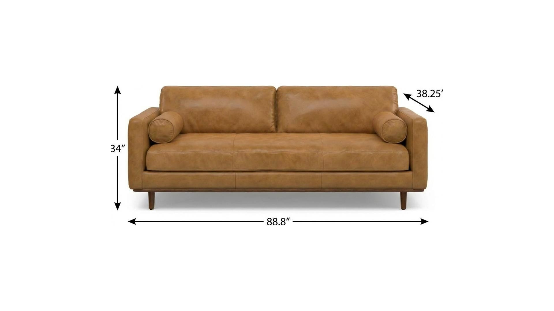 Superior construction from fabulously soft and high grade leather gives this 89-inch sienna leather sofa with brown legs a leg up on the competition. The premium leather used makes your lounging luxuriously comfortable and adds an elegant appeal to your space. Solid colors give you lots of decorative options and are easy to work into your decor scheme. Web suspension construction gives this piece strong support and makes it comfortable to sit even for long periods of time. Removable back cushions make this sofa easy to manage. Fixed arms offer a comfy place to rest. A great showpiece for your room, this sofa is a must have. 34.00-inch h x 88.80-inch w x 38.25-inch d.