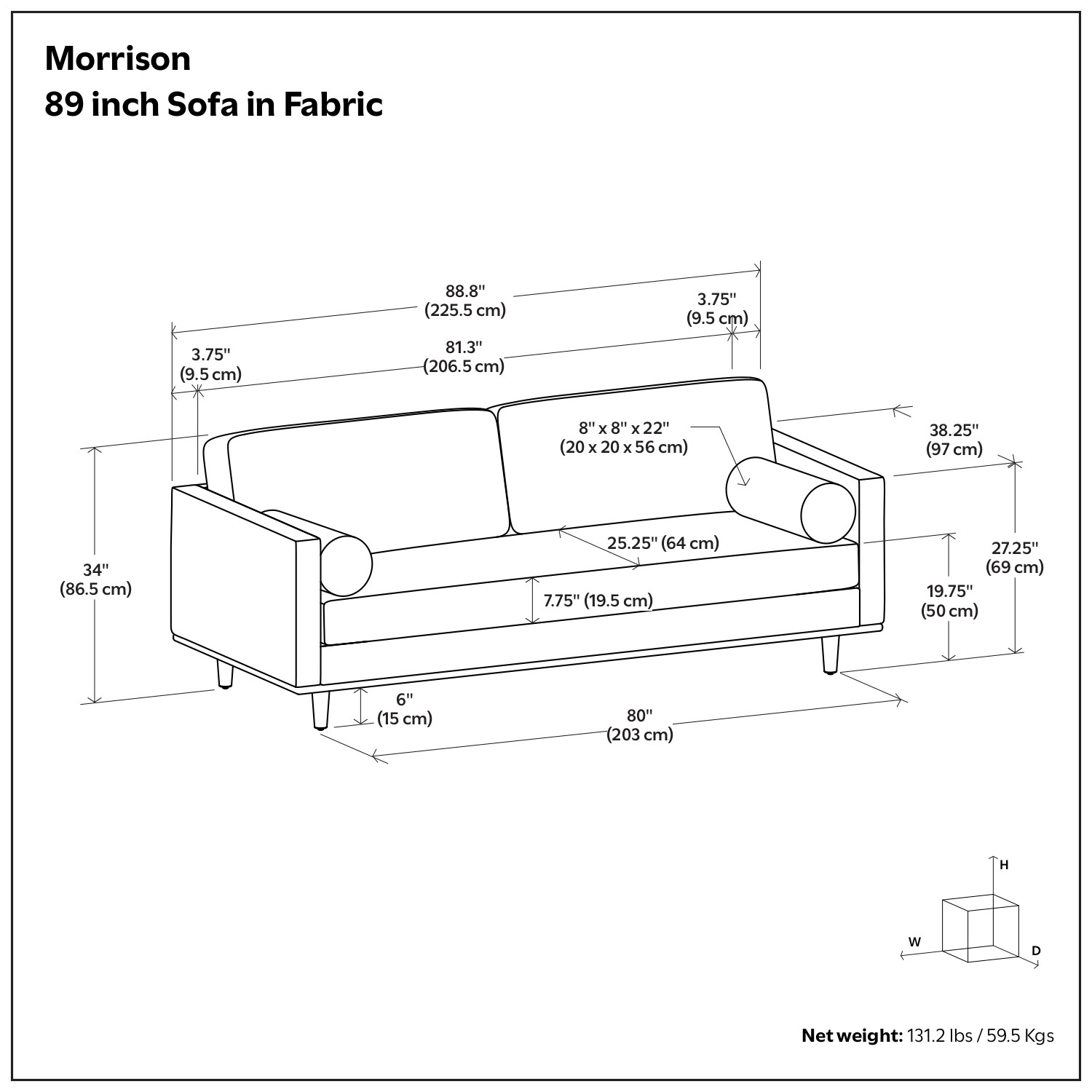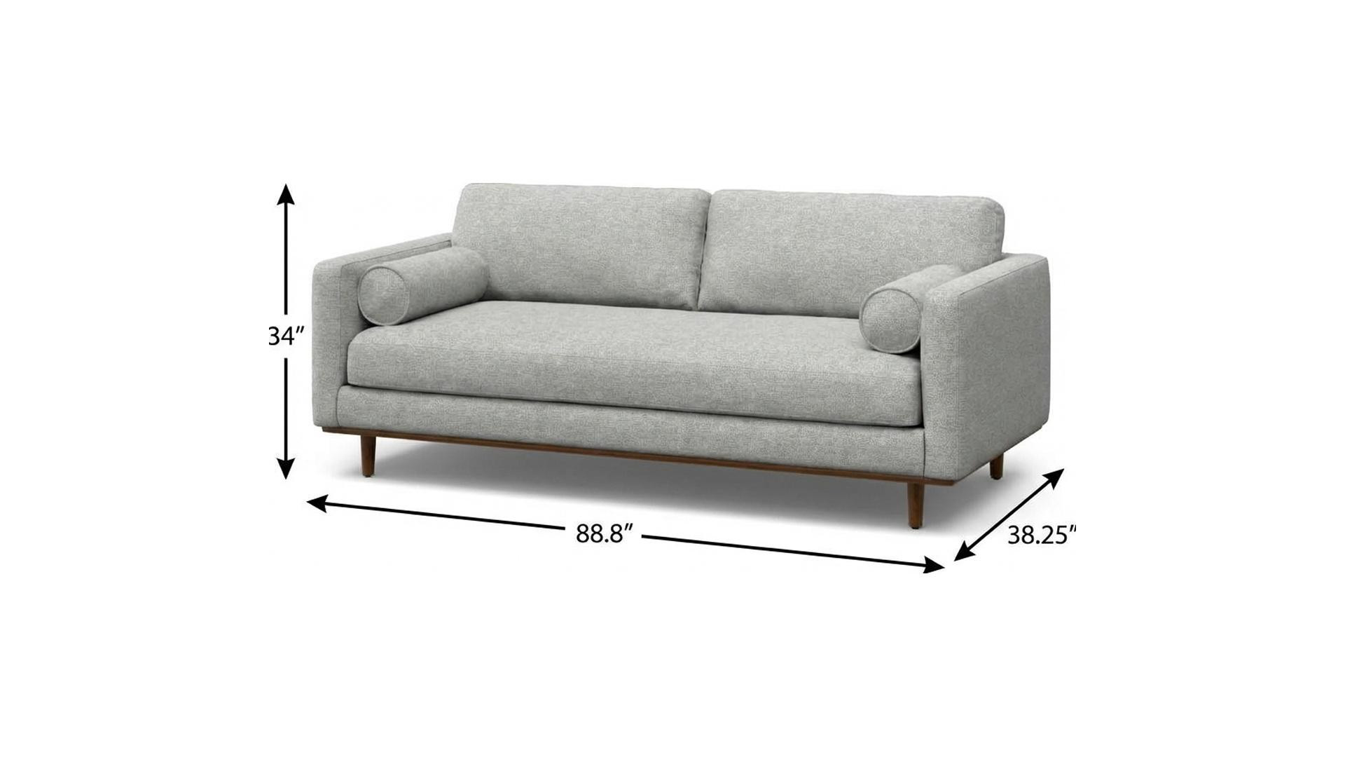 Transform your home's interior with this luxurious 89-inch gray fabric sofa with brown legs. Solid colors give you lots of decorative options and are easy to work into your decor scheme. Web suspension construction gives this piece strong support and makes it comfortable to sit even for long periods of time. Removable back cushions make this sofa easy to manage. Fixed arms offer a comfy place to rest. A great showpiece for your room, this sofa is a must have. 34.00-inch h x 88.80-inch w x 38.25-inch d.