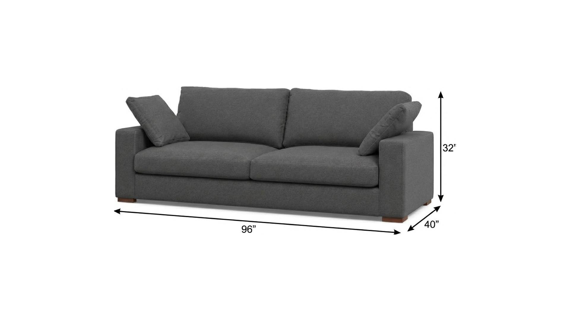 Designed for comfort and good looks, this 96-inch gray fabric sofa with brown legs is a great option to anchor your space. Solid colors give you lots of decorative options and are easy to work into your decor scheme. Web suspension construction gives this piece strong support and makes it comfortable to sit even for long periods of time. Fixed arms offer a comfy place to rest. A great showpiece for your room, this sofa is a must have. 32.00-inch h x 96.00-inch w x 40.00-inch d.