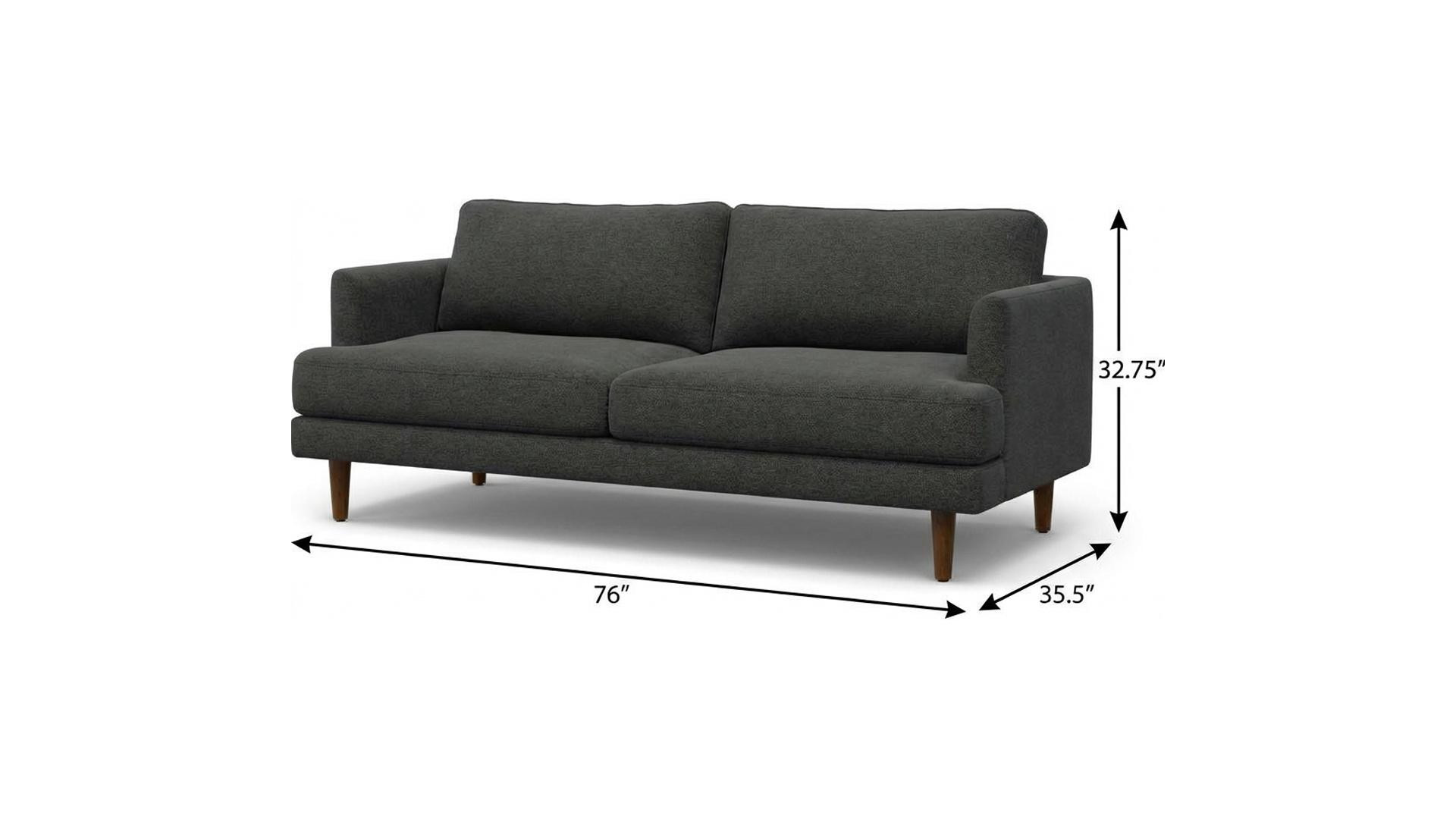 Add an air of fashion to your space with this fabulous 76-inch gray fabric sofa with brown legs. Solid colors give you lots of decorative options and are easy to work into your decor scheme. Web suspension construction gives this piece strong support and makes it comfortable to sit even for long periods of time. Removable back cushions make this sofa easy to manage. Fixed arms offer a comfy place to rest. Built to last, this sofa will be a great centerpiece for your room. 32.75-inch h x 76.00-inch w x 35.50-inch d.