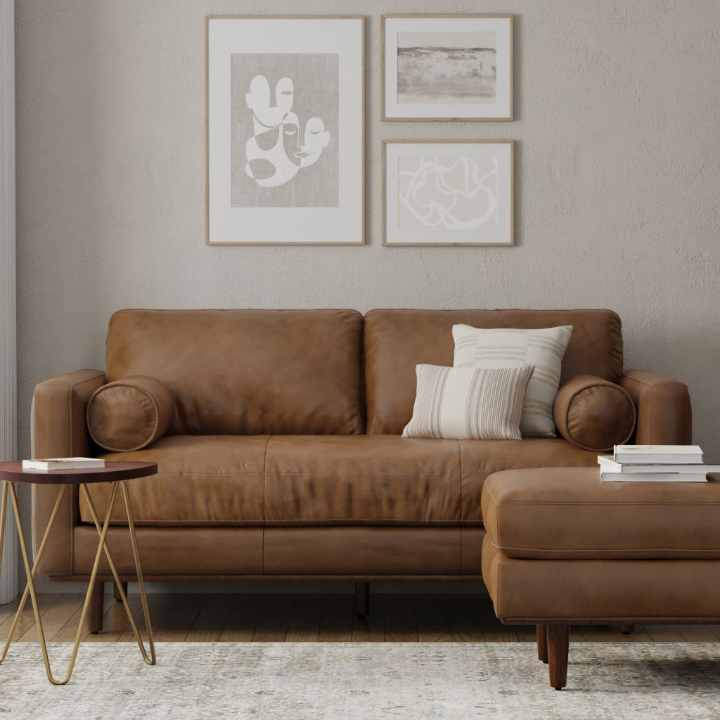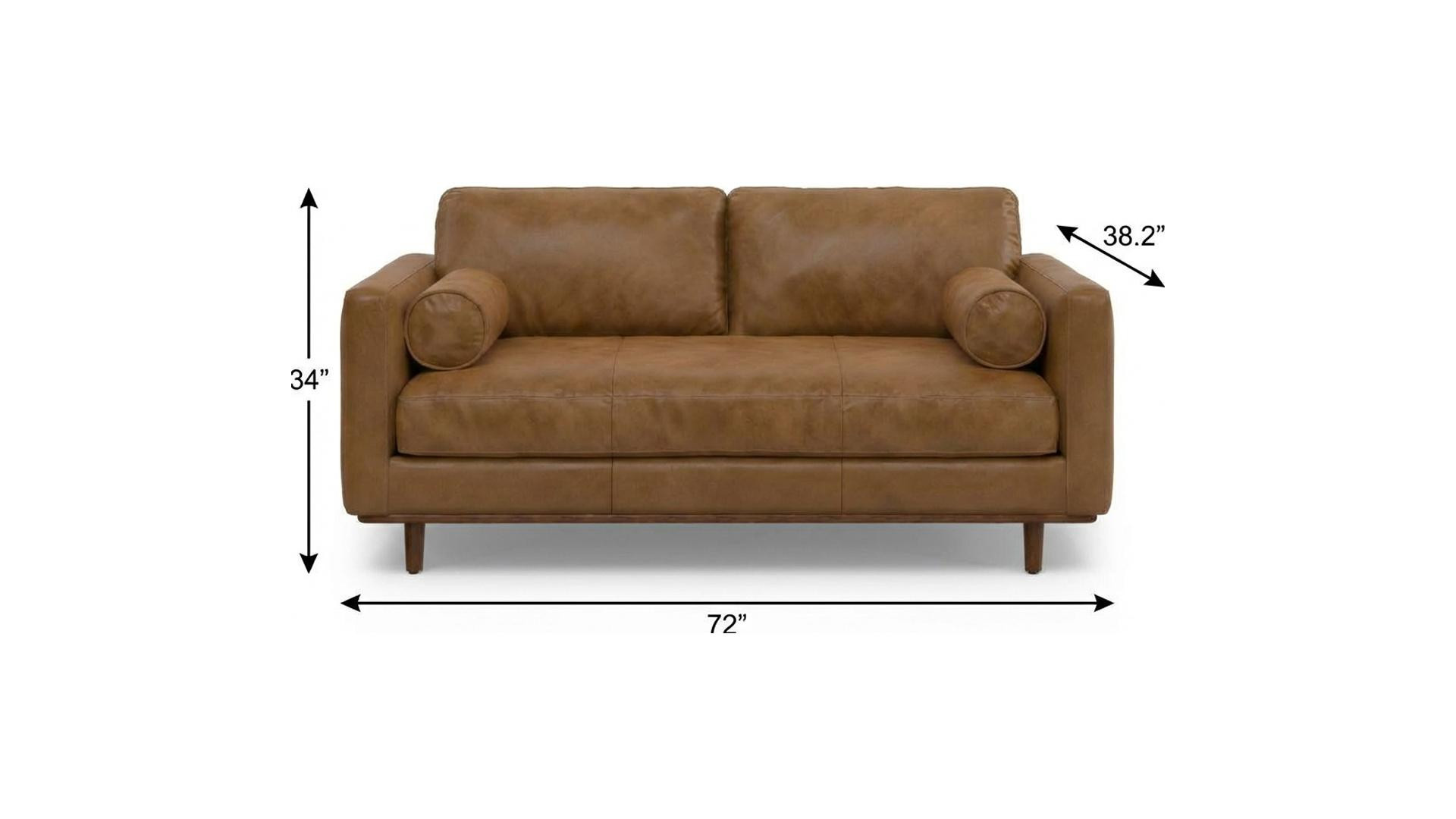 Superior construction from fabulously soft and high grade leather gives this 72-inch brown leather sofa a leg up on the competition. The premium leather used makes your lounging luxuriously comfortable and adds an elegant appeal to your space. Solid colors give you lots of decorative options and are easy to work into your decor scheme. Web suspension construction gives this piece strong support and makes it comfortable to sit even for long periods of time. Removable back cushions make this sofa easy to manage. Fixed arms offer a comfy place to rest. Built to last, this sofa will be a great centerpiece for your room. 34.00-inch h x 72.00-inch w x 38.20-inch d.