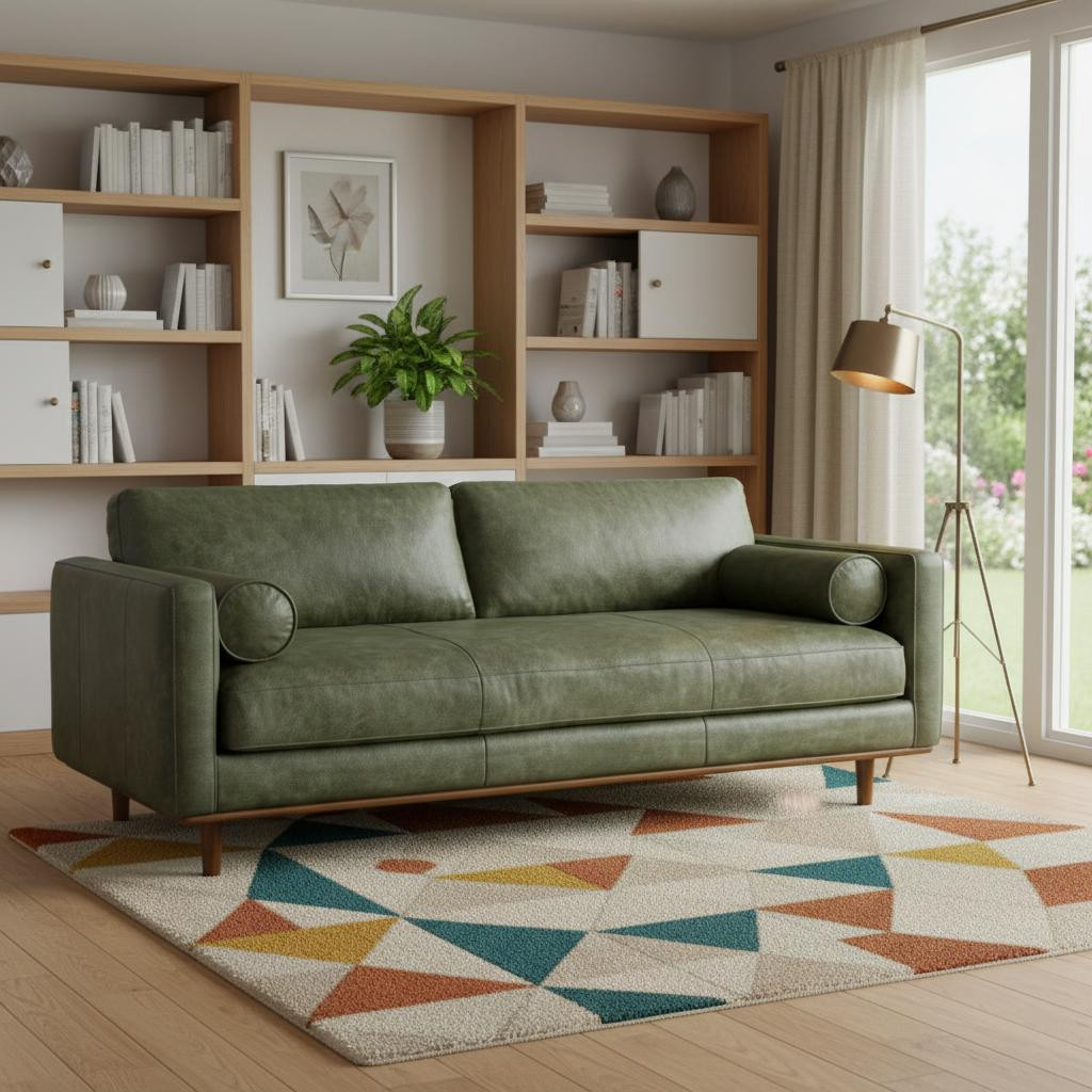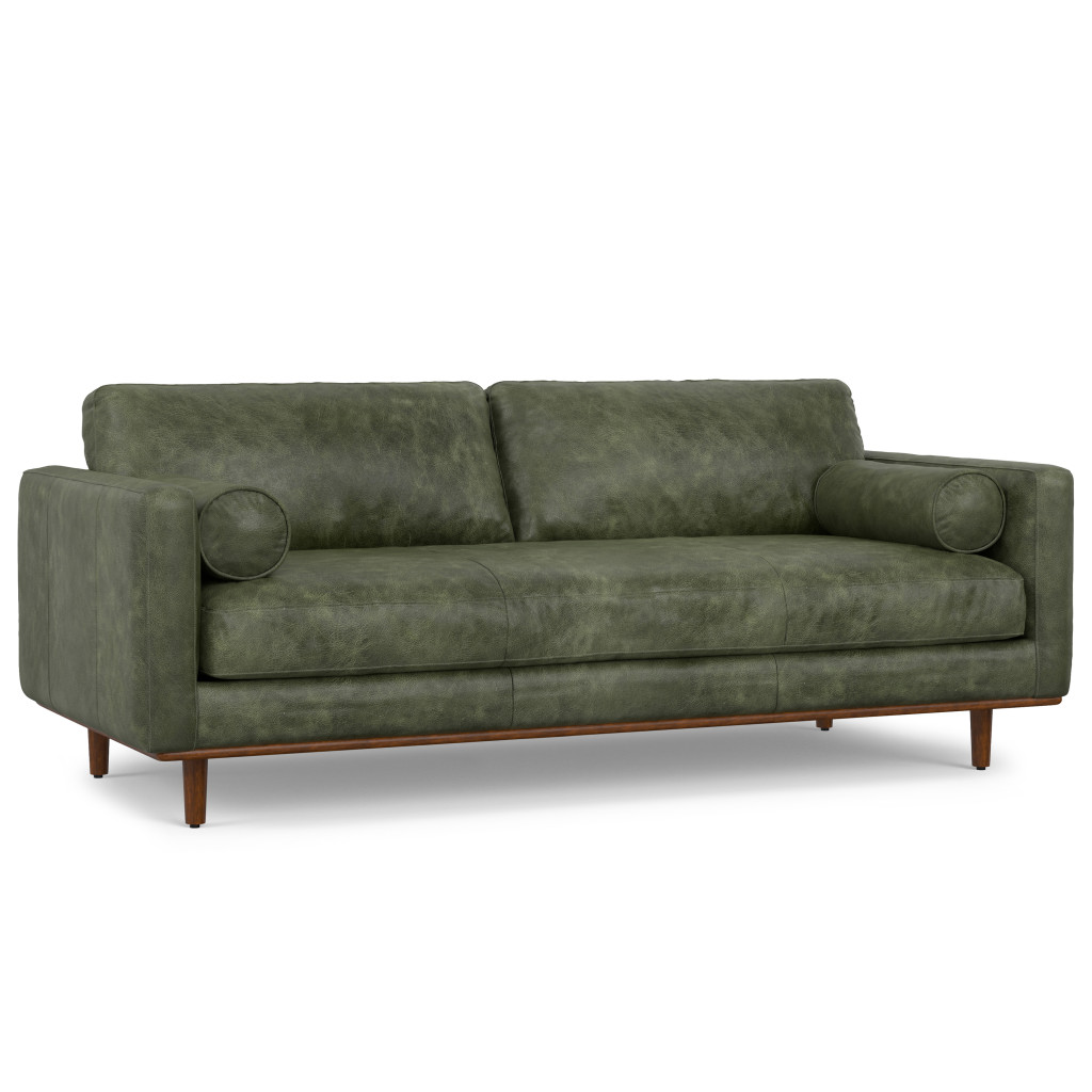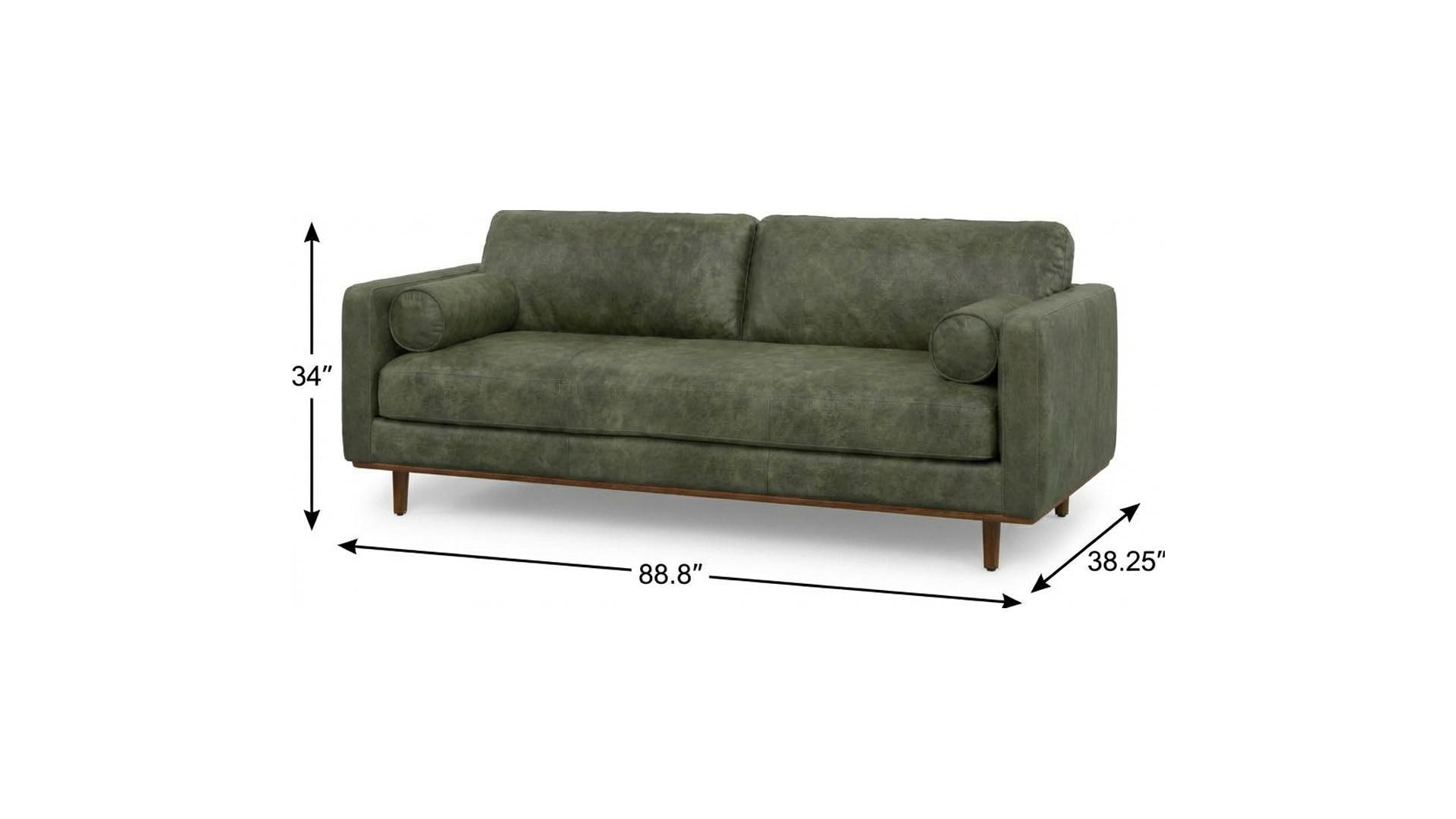 Made of the highest quality, supple leather, this 89-inch moss green leather sofa with brown legs will be the star of your space. The high grade premium leather used makes your lounging luxuriously comfortable and adds an elegant appeal to your space. Solid colors give you lots of decorative options and are easy to work into your decor scheme. Web suspension construction gives this piece strong support and makes it comfortable to sit even for long periods of time. Fixed arms offer a comfy place to rest. A great showpiece for your room, this sofa is a must have. 34.00-inch h x 88.80-inch w x 38.25-inch d.