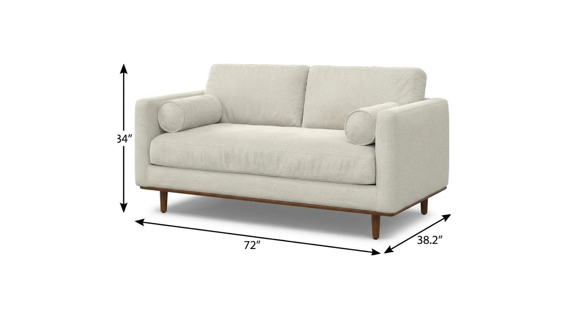 Add an air of fashion to your space with this fabulous 72-inch cream fabric sofa with brown legs. Solid colors give you lots of decorative options and are easy to work into your decor scheme. Web suspension construction gives this piece strong support and makes it comfortable to sit even for long periods of time. Removable back cushions make this sofa easy to manage. Fixed arms offer a comfy place to rest. Built to last, this sofa will be a great centerpiece for your room. 34.00-inch h x 72.00-inch w x 38.20-inch d.