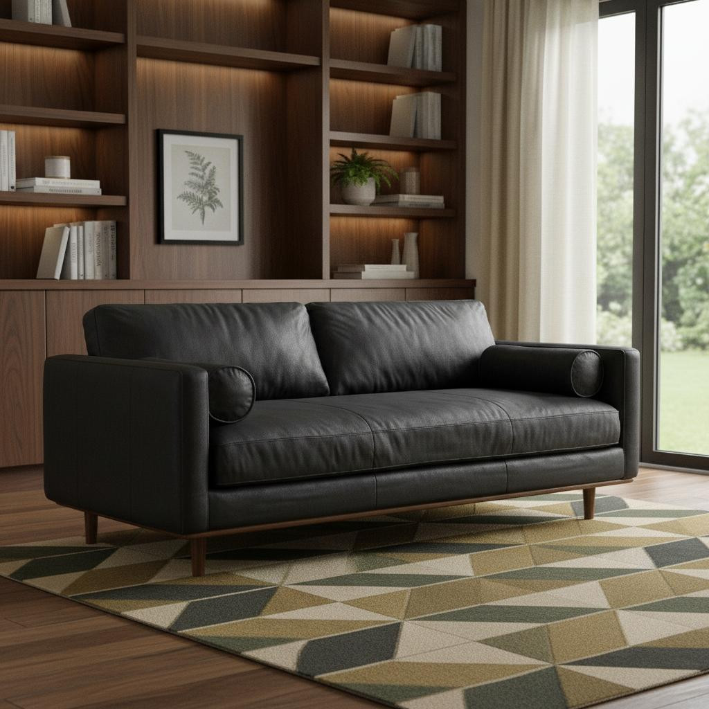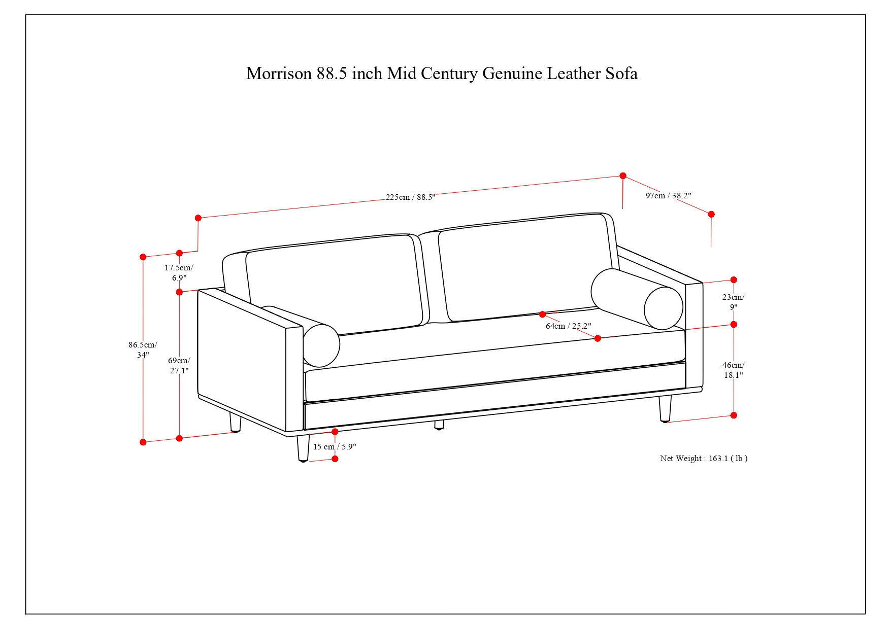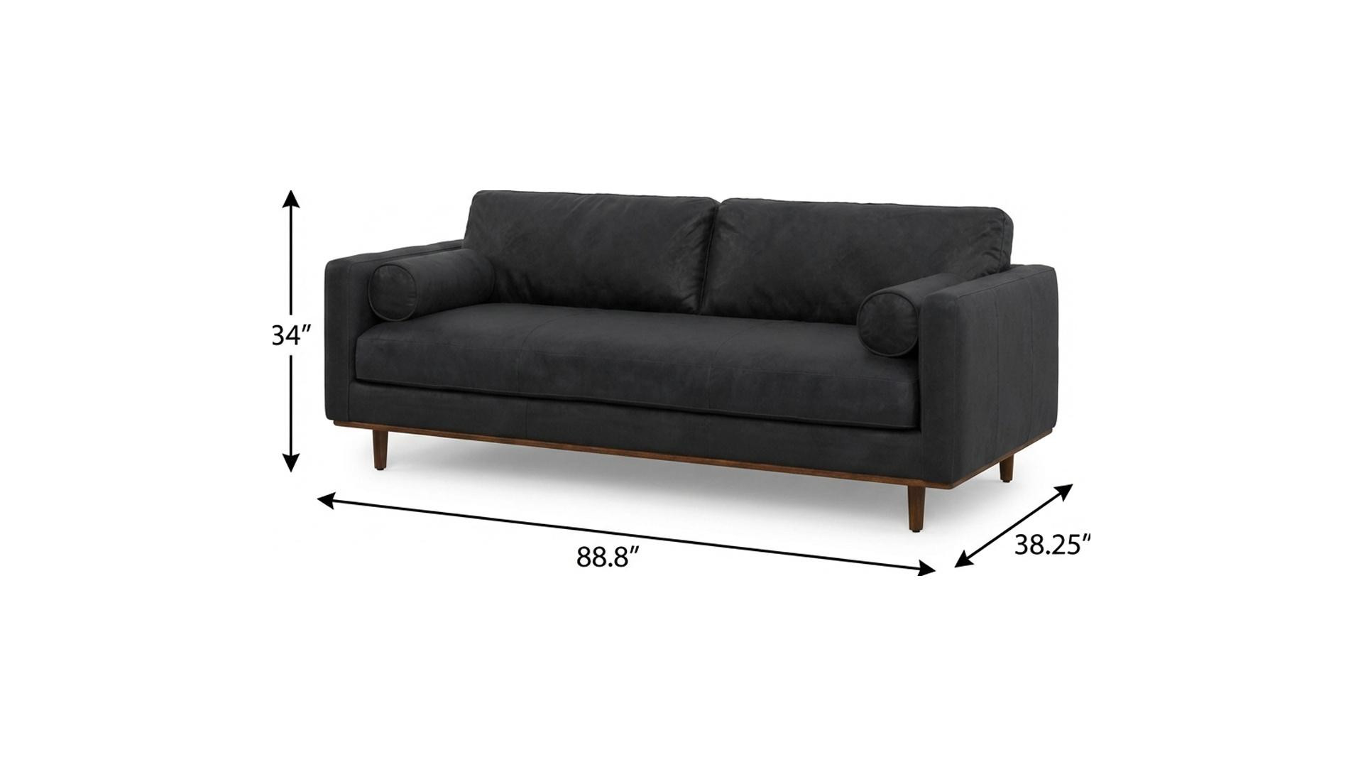 Made of the highest quality, supple leather, this 89-inch black leather sofa with brown legs will be the star of your space. The high grade premium leather used makes your lounging luxuriously comfortable and adds an elegant appeal to your space. Solid colors give you lots of decorative options and are easy to work into your decor scheme. Web suspension construction gives this piece strong support and makes it comfortable to sit even for long periods of time. Fixed arms offer a comfy place to rest. Built to last, this sofa will be a great centerpiece for your room. 34.00-inch h x 88.80-inch w x 38.25-inch d.