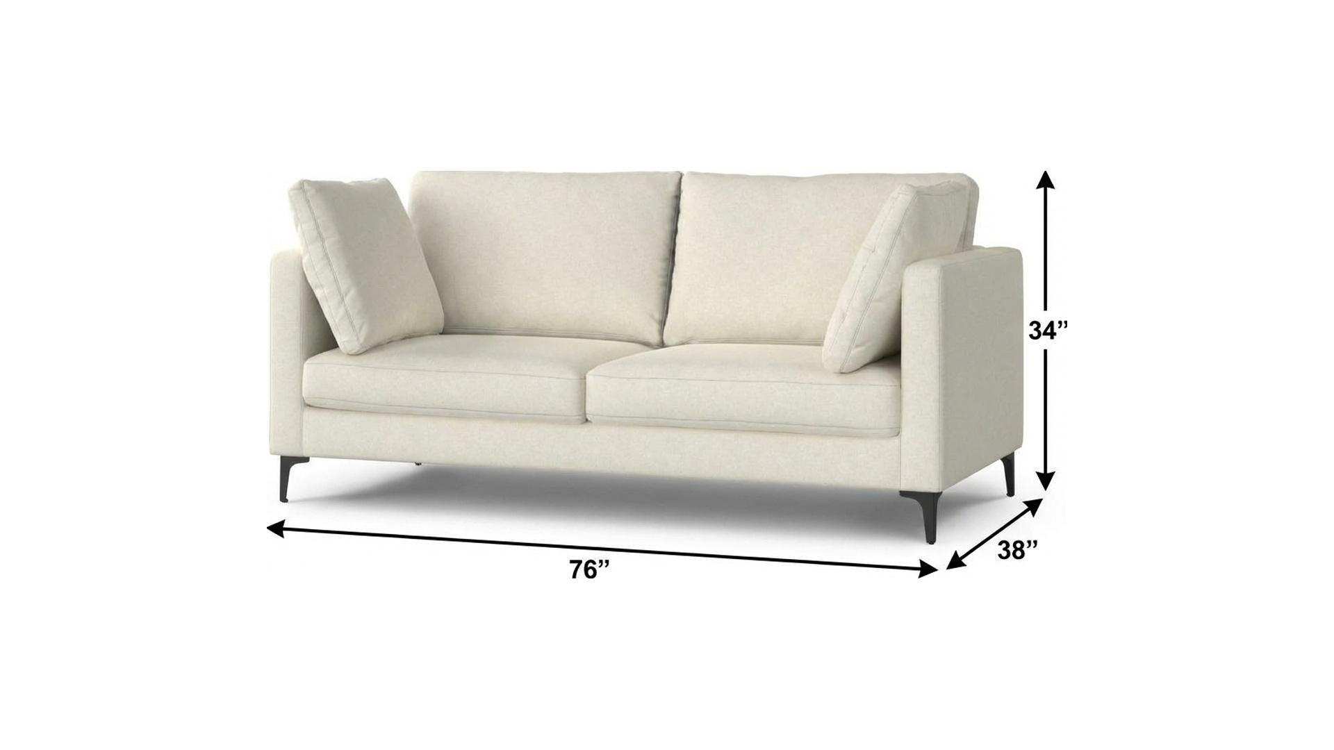 Transform your home's interior with this luxurious 76-inch cream fabric sofa with black legs. Solid colors give you lots of decorative options and are easy to work into your decor scheme. Web suspension construction gives this piece strong support and makes it comfortable to sit even for long periods of time. Removable back cushions make this sofa easy to manage. Fixed arms offer a comfy place to rest. Black metal legs effortlessly elevate the room and add a touch of contemporary design. Built to last, this sofa will be a great centerpiece for your room. 34.00-inch h x 76.00-inch w x 38.00-inch d.