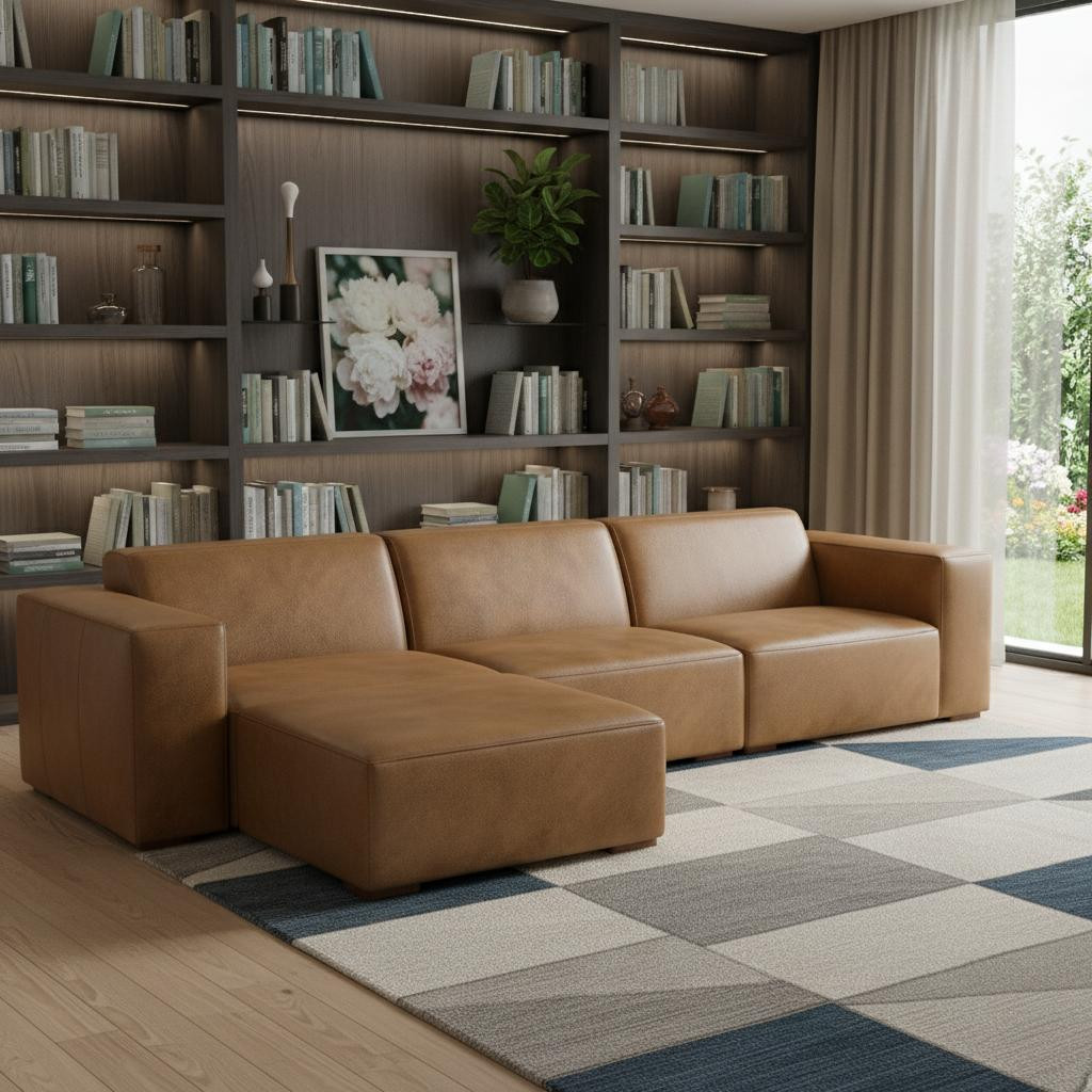 Superior construction from fabulously soft and high grade leather gives this 122-inch brown leather modular sofa a leg up on the competition. The premium leather used makes your lounging luxuriously comfortable and adds an elegant appeal to your space. Solid colors give you lots of decorative options and are easy to work into your decor scheme. Web suspension construction gives this piece strong support and makes it comfortable to sit even for long periods of time. Fixed arms offer a comfy place to rest. Built to last, this sofa will be a great centerpiece for your room. 27.00-inch h x 122.00-inch w x 69.50-inch d.